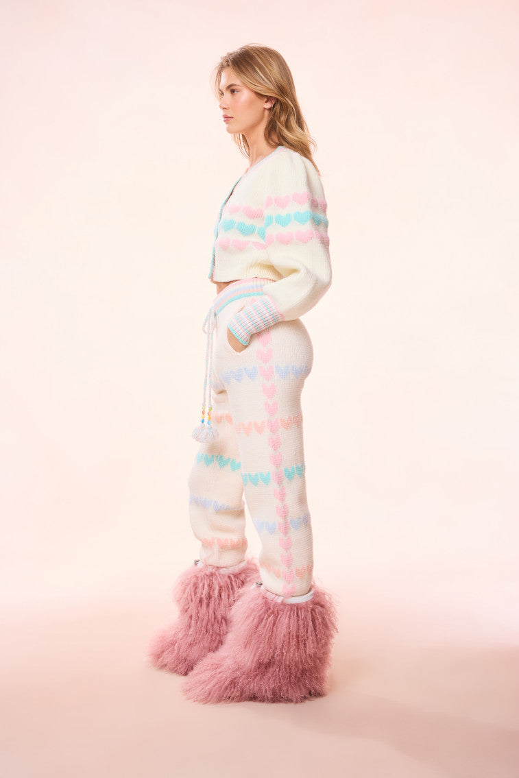 You asked. we answered. Our original knit Chabela Pant is back as part of our Re-Edition Collection. This signature style returns in her original. multi-colored placed heart jacquard. Cozy and cute. these charming pants feature a striped waistband and cuff at the leg opening and a beaded. tassel drawcord. Pair with the Buena Cardigan for the full original set.