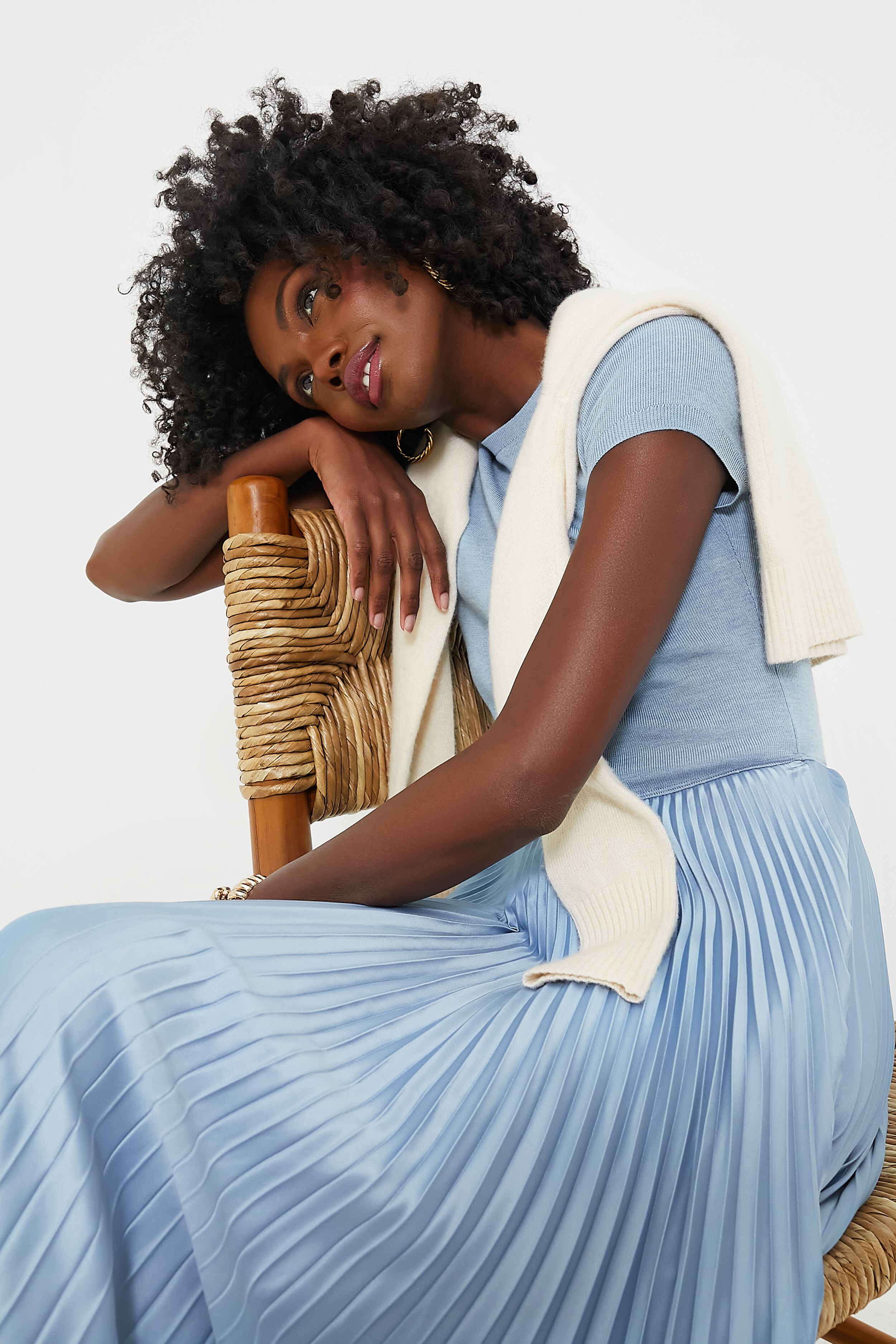 Perfectly combining elegance and femininity into a fabulous frock. the Chambray Blue Gloria Day Dress is a chic addition to any wardrobe. With a soft sweater-like bodice and a silky pleated skirt that creates an interesting mixed media vibe. this is a great dress up or down piece for any occasion. Pair it with flats for Sunday brunch or for a big meeting in the office. or with heels and a clutch for a cocktail party! Regardless of how you style it. this stunning silhouette is absolutely perfect.
