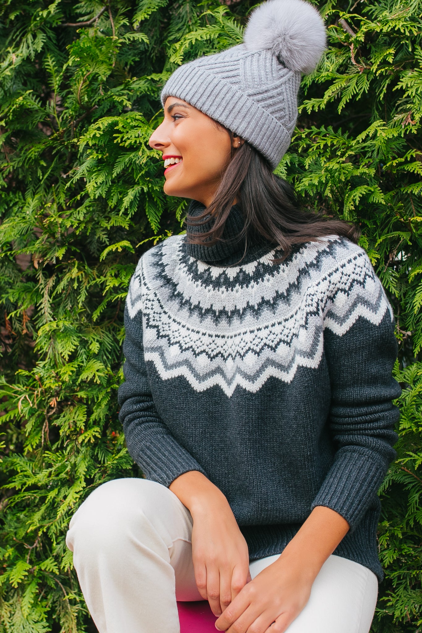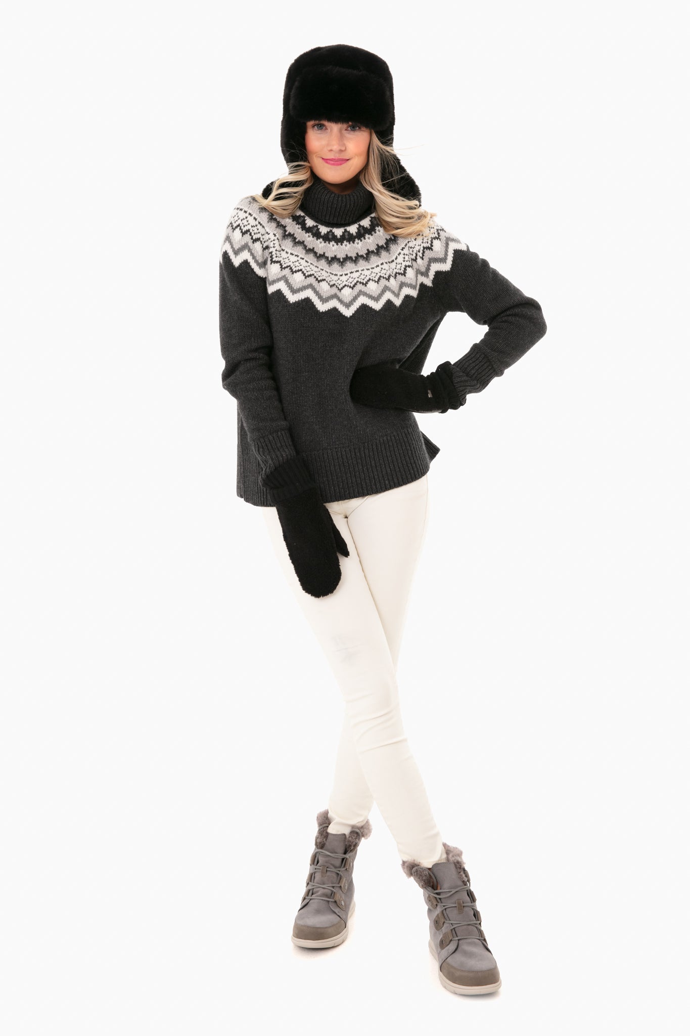 Inspired by the northern lights. the Fair Isle Aurora Turtleneck Sweater encompases traditional arctic patterns with multi colored threads to create the ultimate cozy winter knit. The rolled turtleneck and ribbed cuffs and hem add the perfect touch of vintage to this fun piece.