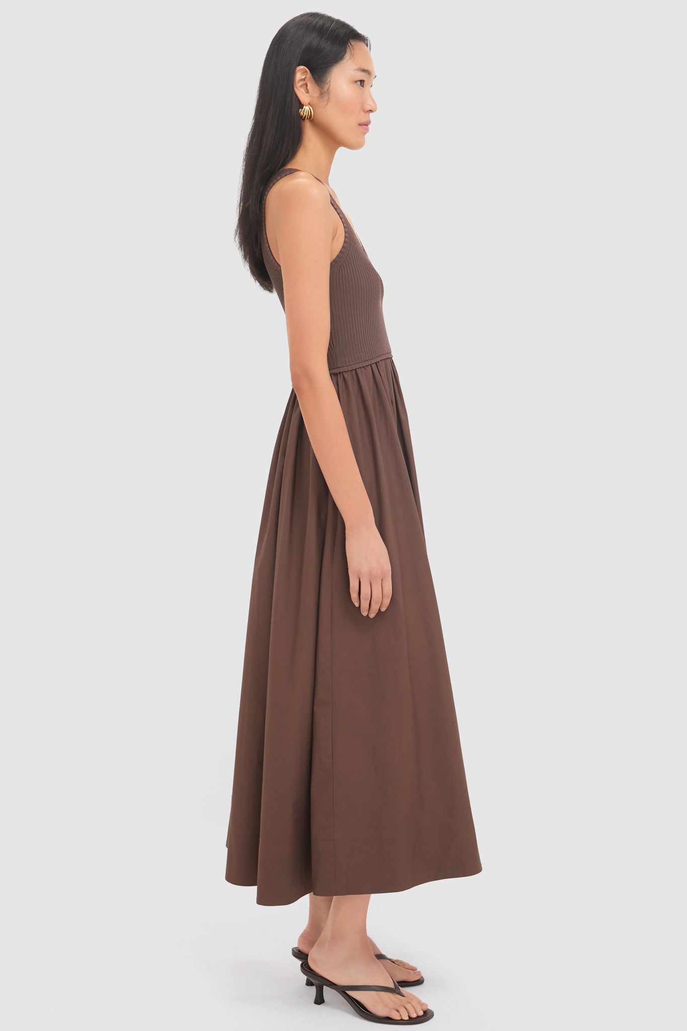 The Chocolate Poplin Racer Dress is a versatile style you need in your wardrobe. With a fitted knit bodice. gathered skirt. and piping detailing. this dress can be dressed up or down. We paired it with flats. gold jewelry. and a handbag for everyday wear or pair with heels and a clutch for special occasions!