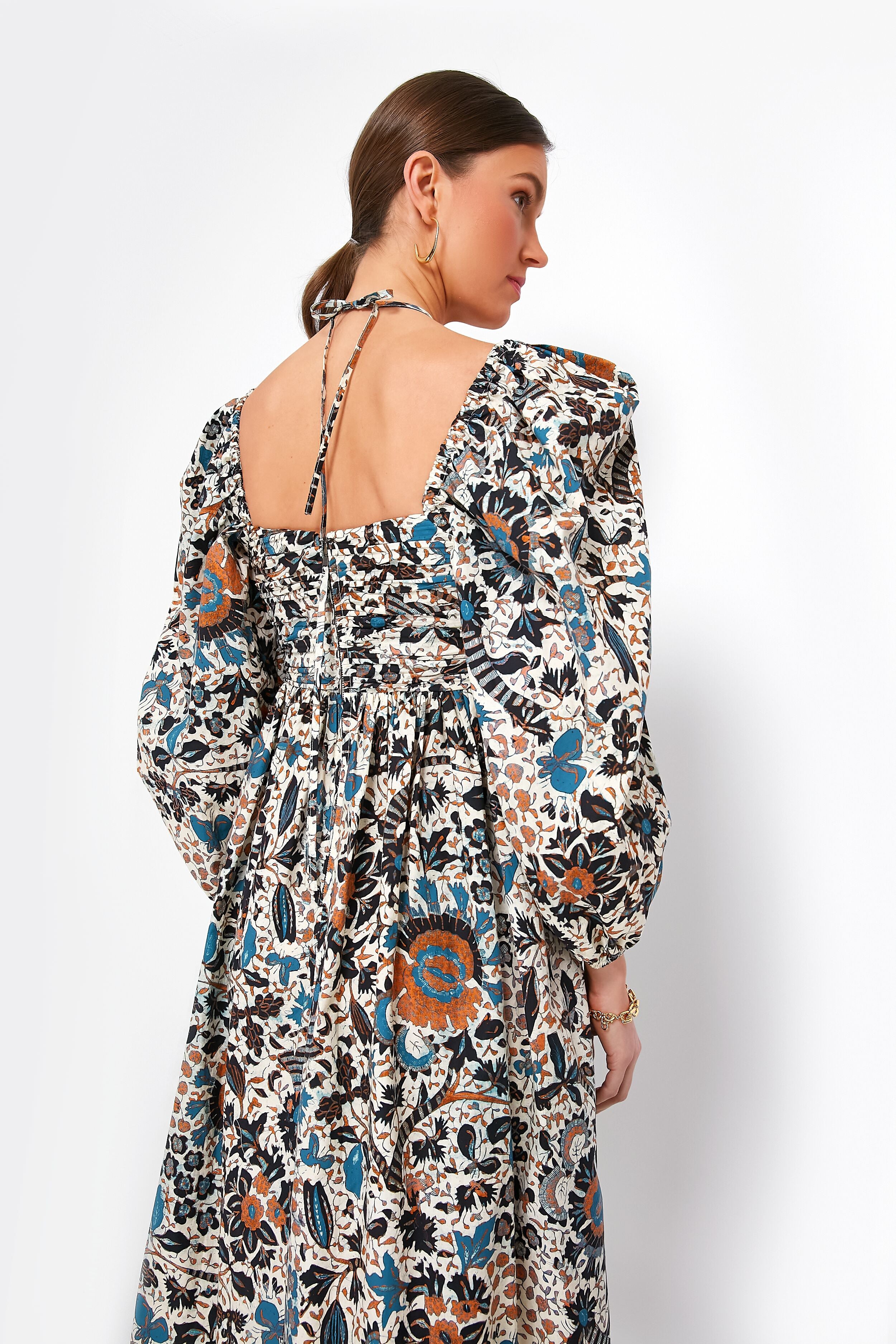 A three-season stunner in a unique paisley-inspired print. the Clematis Alessa Dress is a must-have for transitional dressing. A classic square neckline is elevated by the addition of halter neck ties. while balloon sleeves. a ruched bodice. and keyhole cutouts add extra details that make this silhouette feel special. Pair with boots on chillier days. or with sandals and sunglasses as the temps heat up!