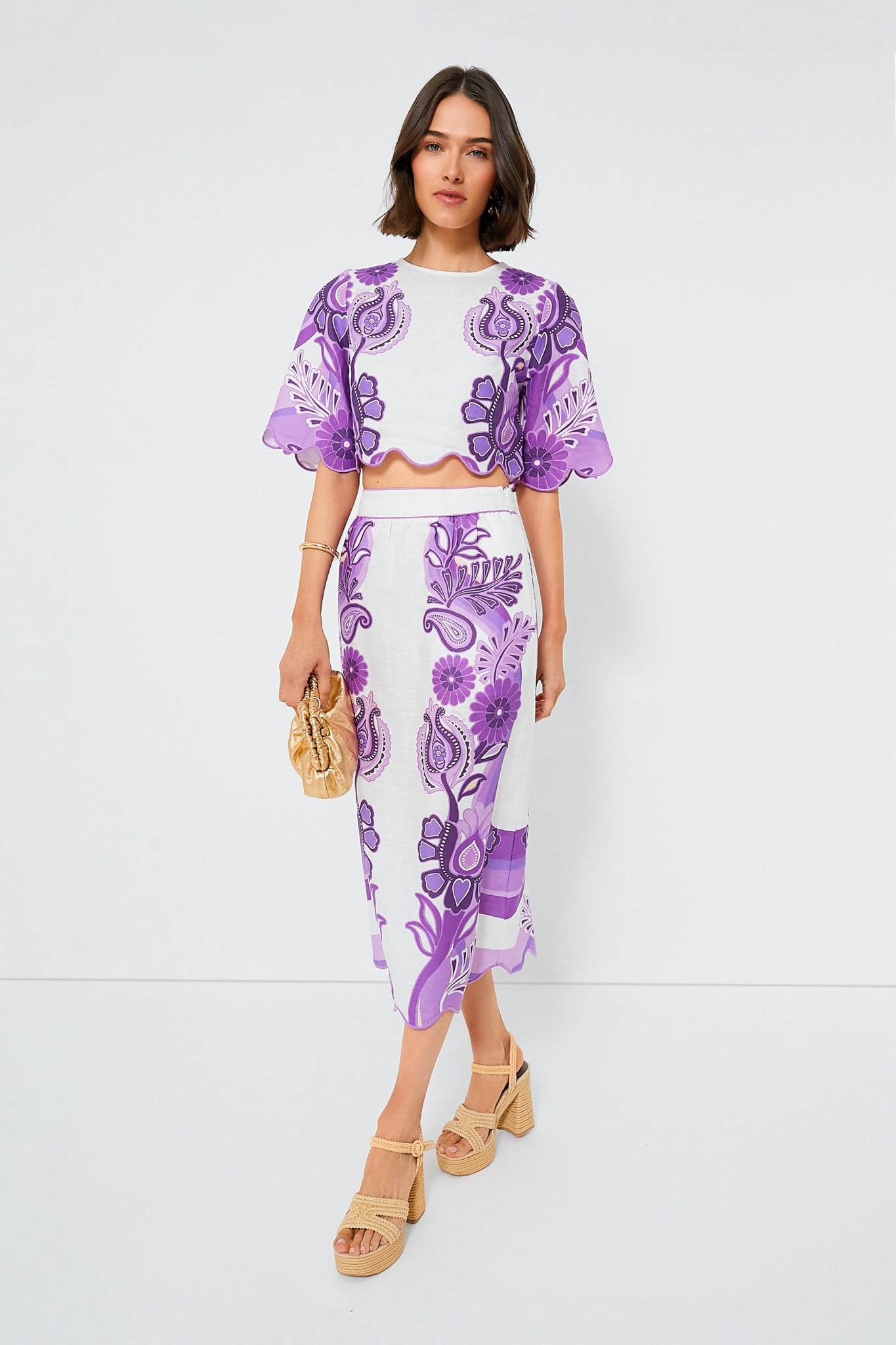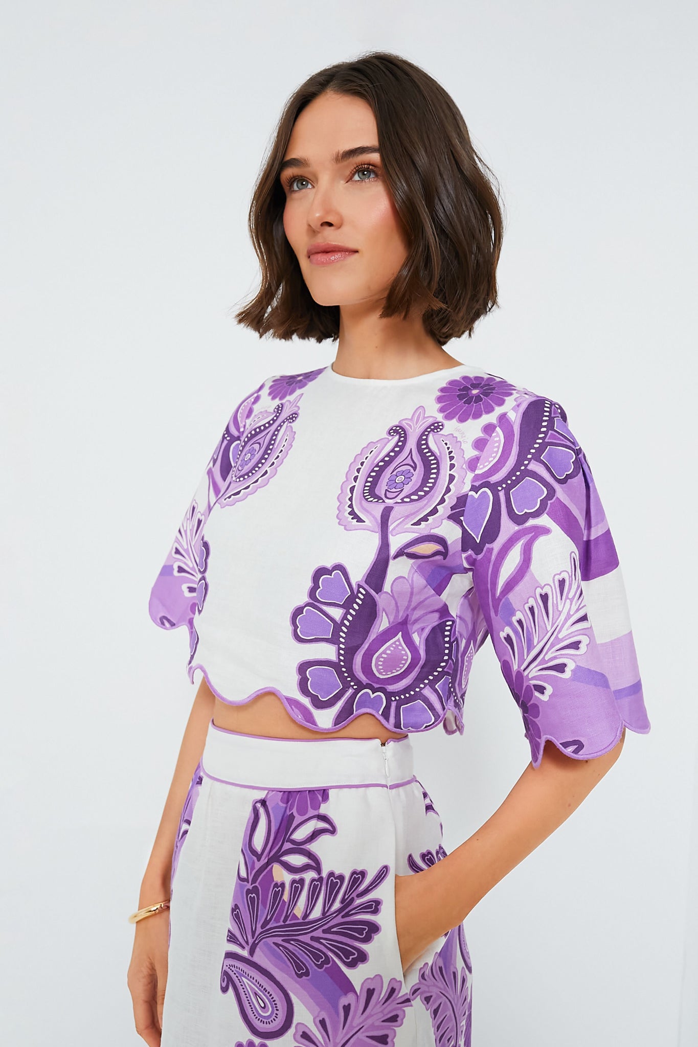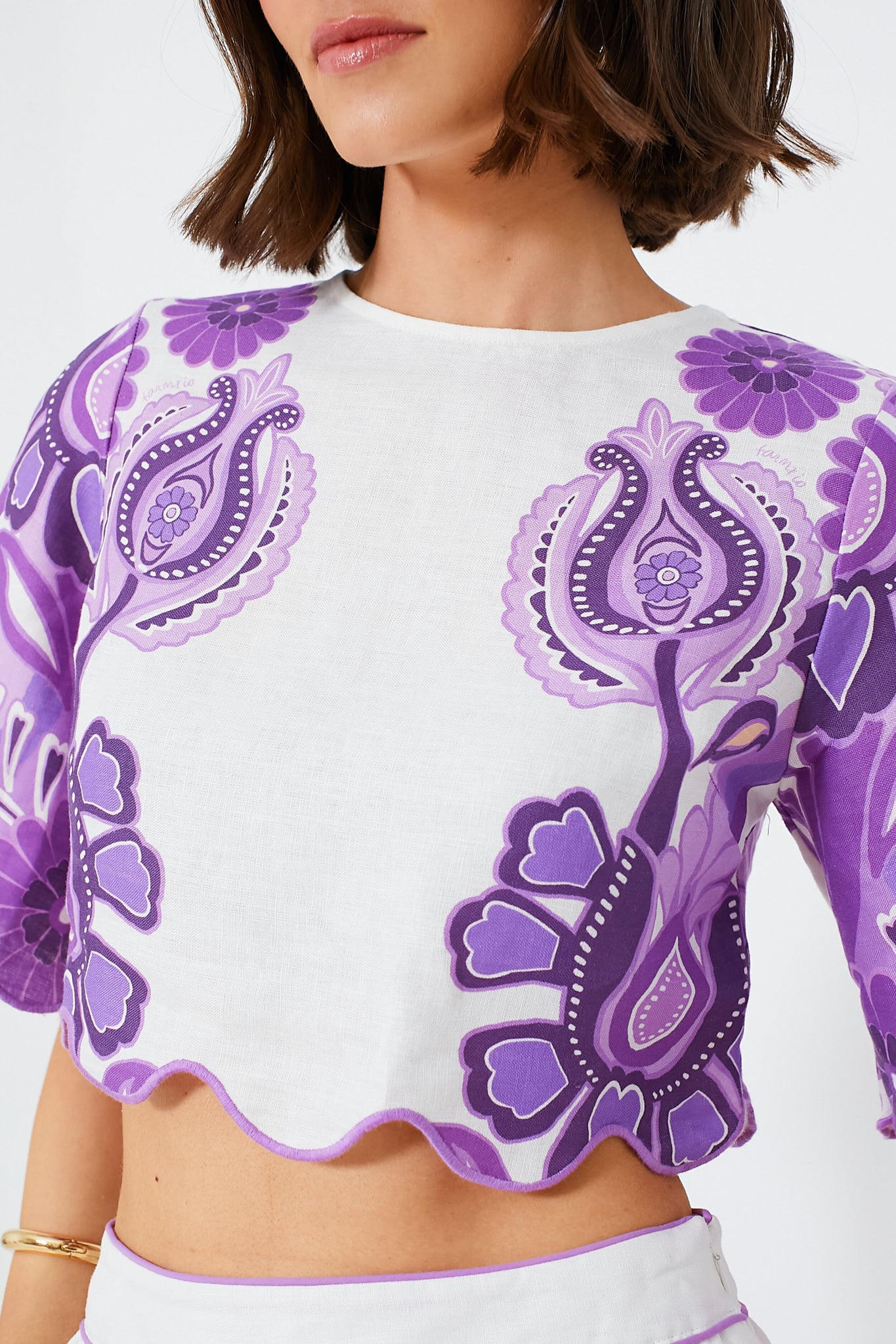 Infuse your wardrobe with a touch of Brazilian flair with the Color Festival Cream Cropped Blouse. Crafted from responsibly sourced materials. this crop top dazzles with its vibrant purple folk-inspired patterns that complement the natural cream base. A round neckline gracefully frames the face. while the floaty. cropped silhouette boasts playful flared sleeves that add a whimsical movement to every gesture. Perfectly paired with high-waisted bottoms or matching Color Festival Cream Midi Skirt. this blouse celebrates the joyous spirit of Farm Rio's unique style ethos.
