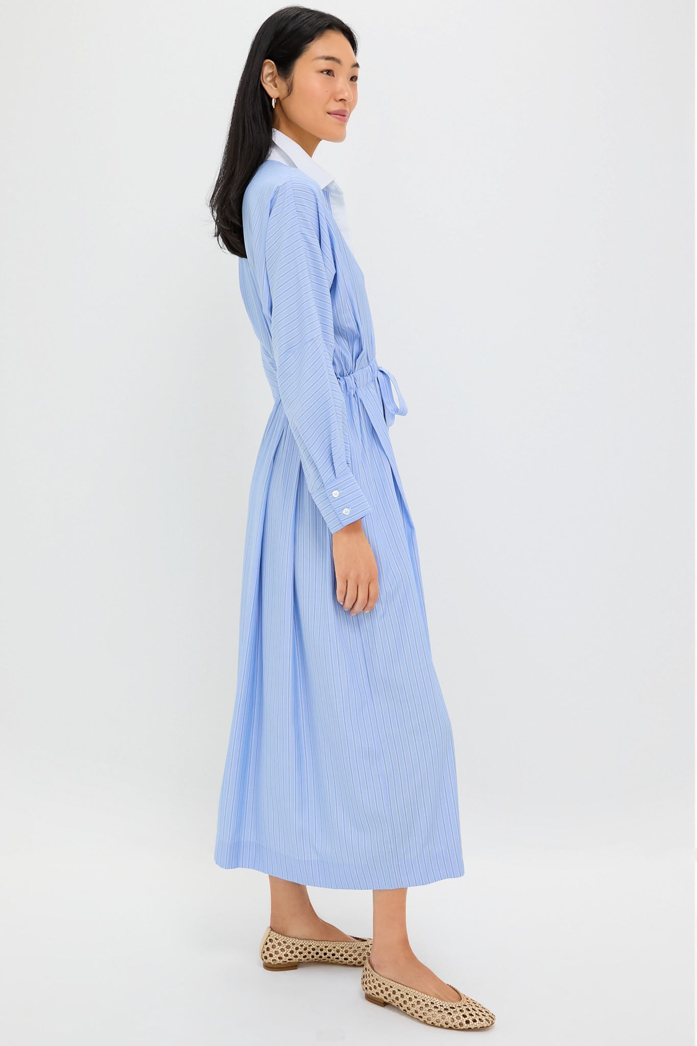 The Cornflower Blue Stripe Tie Front Anna Dress blends crisp tailoring with relaxed femininity. The structured collar and button-down details add polish. while the adjustable waist tie cinches for the perfect fit. Whether you're heading to the office or a weekend brunch. pair it with ballet flats for a chic daytime look or strappy heels for an elevated touch.
