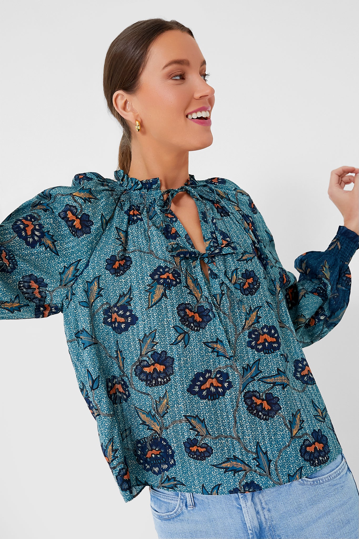 Boho-chic has never looked better than the Cornflower Kaitlyn Blouse. Made from a luxe cotton-viscose blend that is soft yet breezy. and adorned with breathtaking blue botanicals. this relaxed top is sure to wow. Complete with voluminous sleeves and neckties you can fasten or leave undone for a slightly sultry touch. this is a wardrobe winner when paired with denim. shorts. and more.