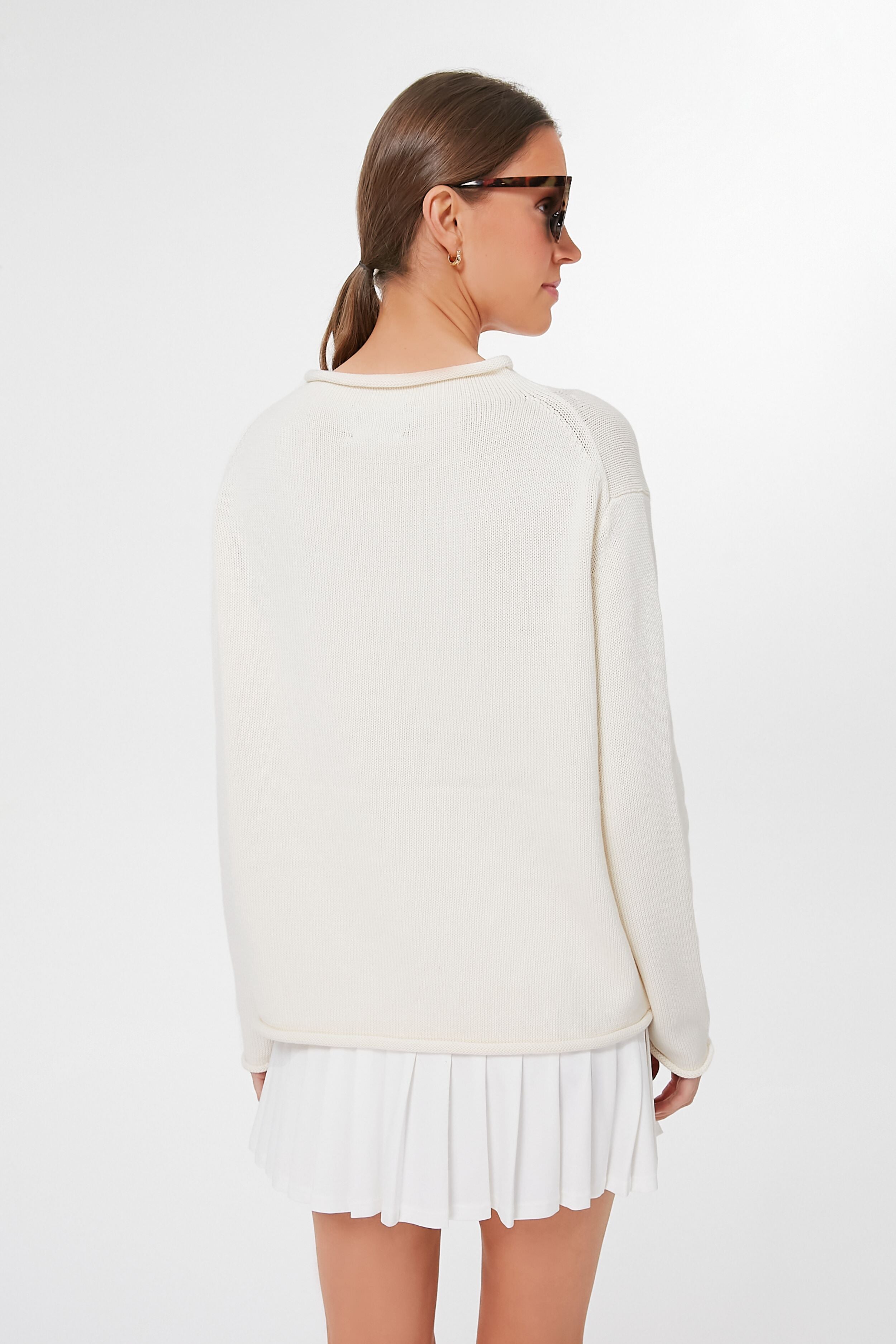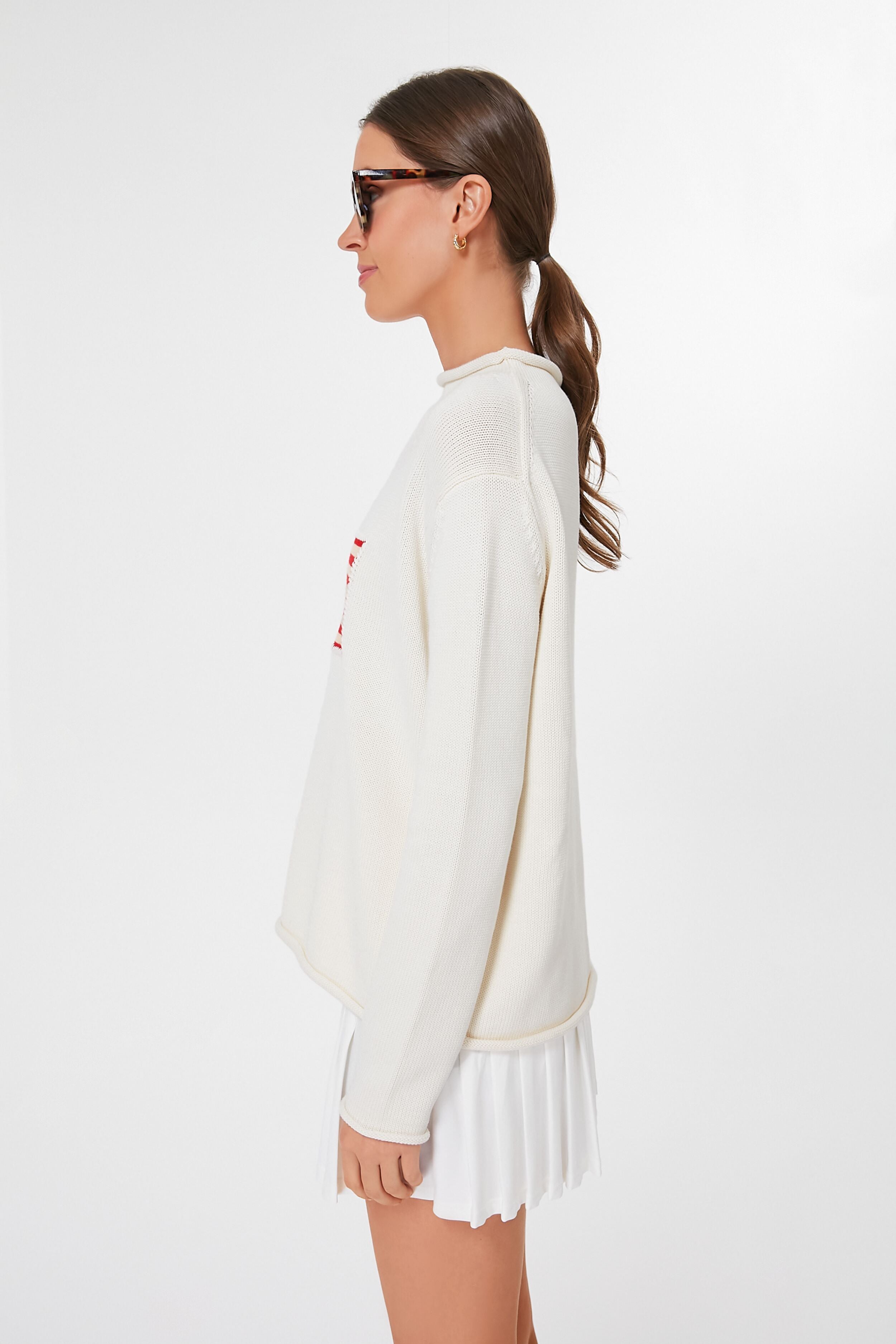A closet essential and customer favorite. the Cotton Ivory Americana Sweater evokes a nostalgic feeling while featuring modern design details for a classic and chic look. This seasonless. 100% cotton pullover will take you from crisp cool walks to backyard BBQs to family game night with its boxy fit and intarsia flag front and center.