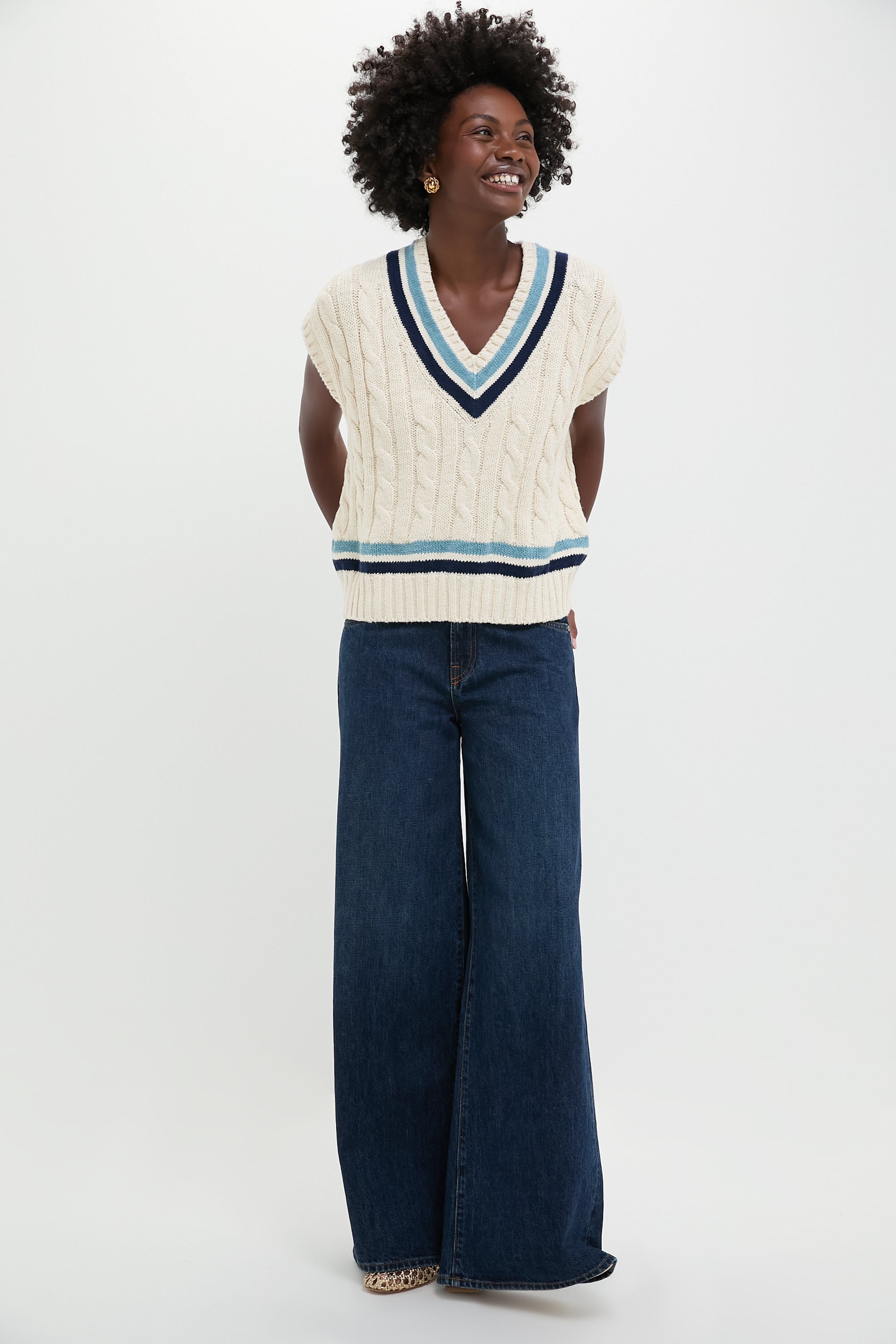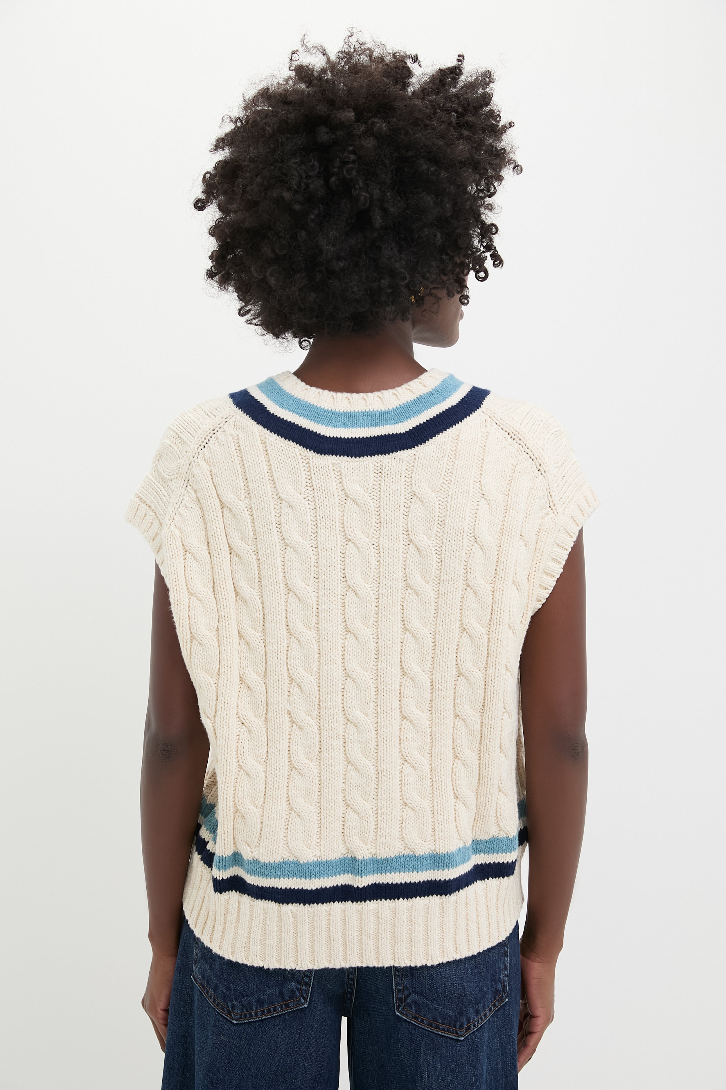 The Cream and Blue Multi Sleeveless V-Neck Pullover Sweater is inspired by iconic vintage style. With detailed contrast striped trim at the collar and hem and a cable knit with rib-knit hems. this piece is perfect for layering or being warn on its own. We paired it with jeans. flats. and a handbag for a polished. everyday look!