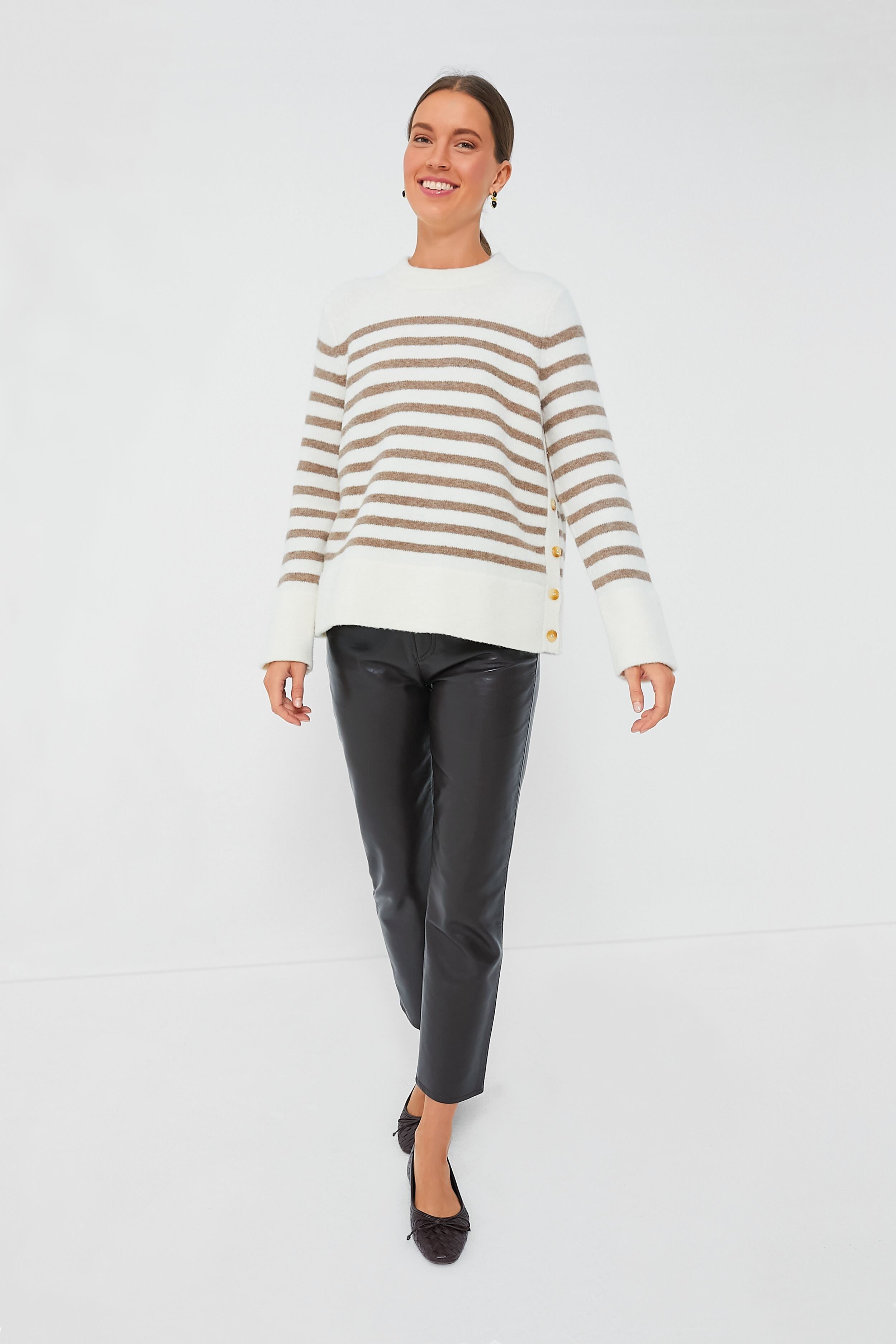 A must-have for refreshing your knitwear collection this season. the Cream and Tan Bonnie Sweater is effortlessly chic. Classic horizontal stripes are given a fresh update with a sophisticated neutral palette. a super-soft wool blend. and split sides with button detailing that can be done up or left open for some movement. Versatile as ever. some of our favorite ways to style this cozy number are layered over a crisp button down with your go-to denim. paired with a mini skirt and flats. or with a sleek jacket and oversized sunnies.