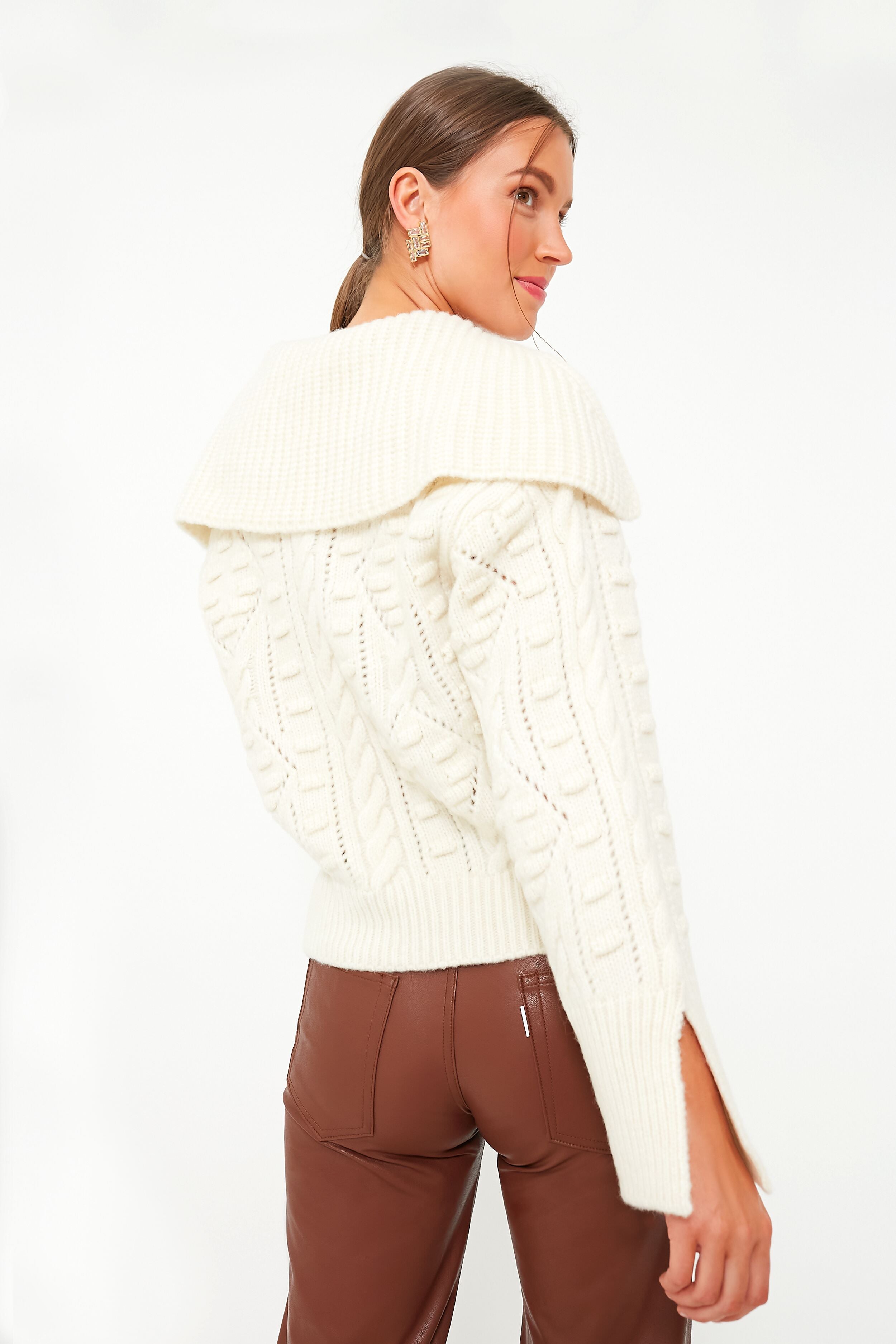 Between the cozy fit and the ultra-wearable neutral colorway. there is nothing not to love about the Cream Cele Sweater. Not your average cable knit. this silhouette features an oversized collar detail that adds a touch of fun to the neckline. and split ribbed cuffs that will let you show off a bracelet or two. Pair with wide leg denim and chunky platforms for a retro vibe. or pair with your classic go-to straight leg jeans and sneakers for a luxe everyday styling.