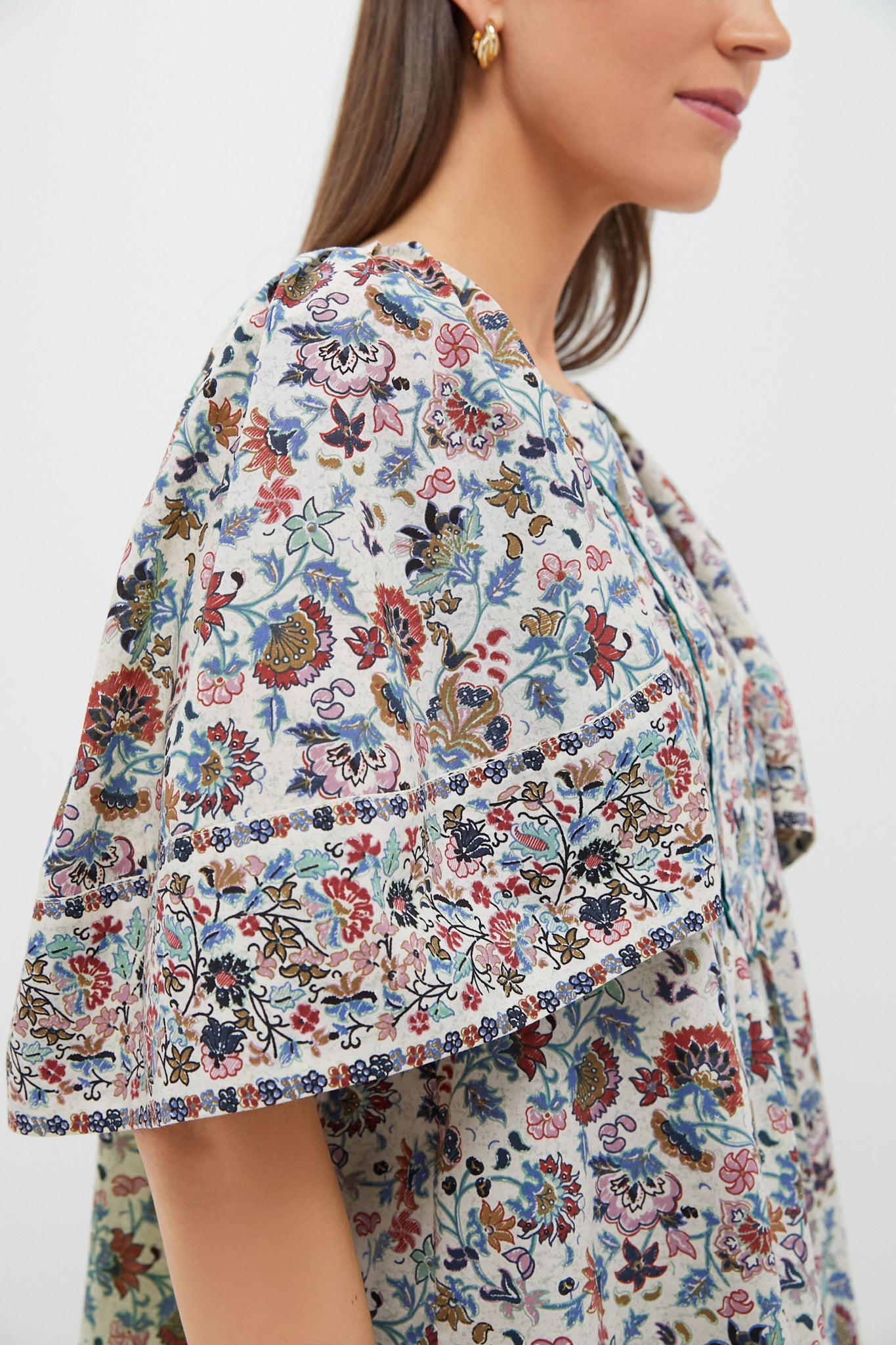 The Finley Flutter Sleeve Top is effortlessly chic. In an intricate chintz print. this blouse has a flattering silhouette. oversized flutter sleeves. and a V-neckline. Pair with the matching Cream Chintz Nova Shorts and gold accessories for everything from resort-stays to brunch season after season. year after year.
