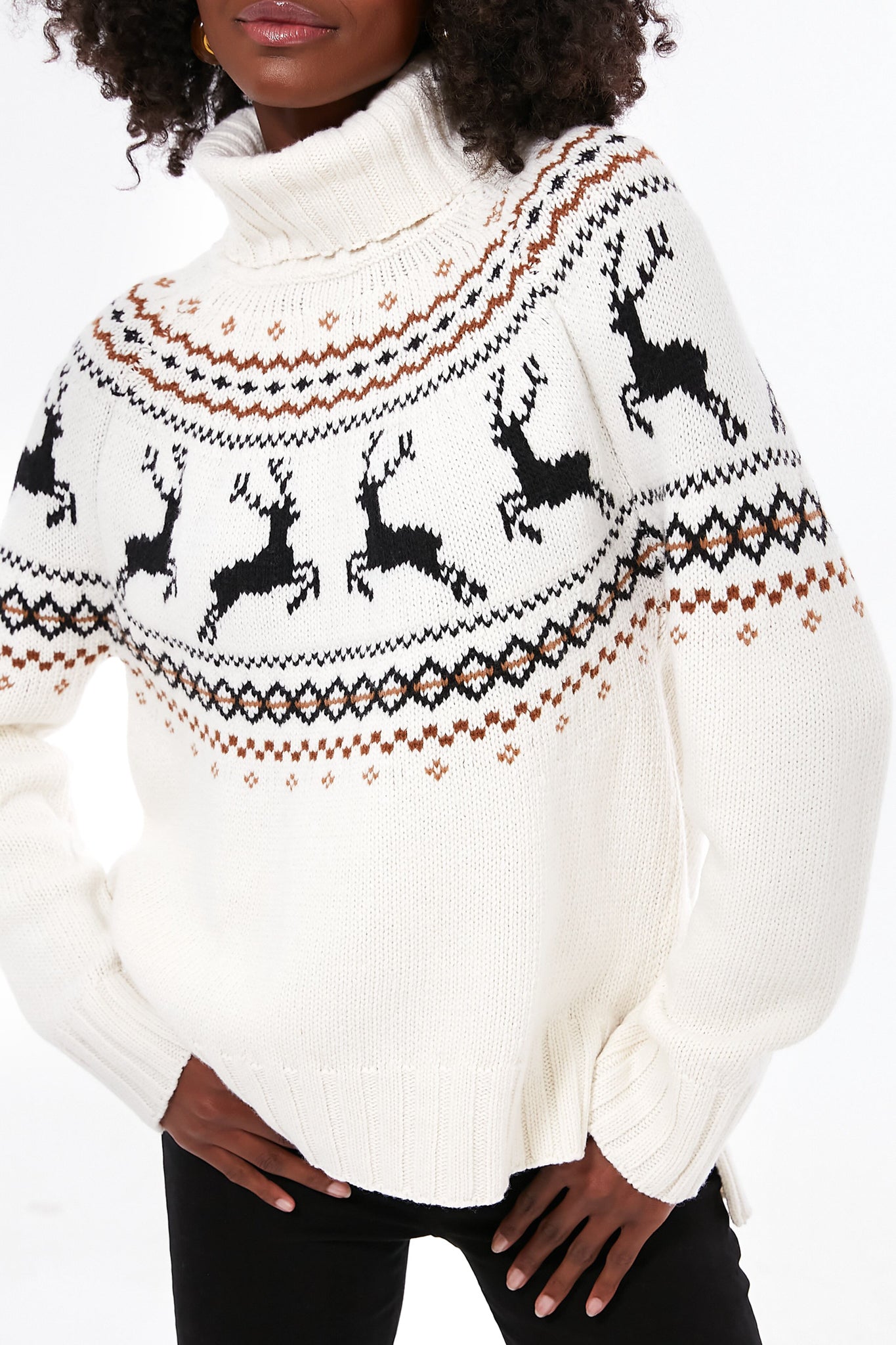 The Cream Kingsbury Knit is a new take on the classic turtleneck. with a charming Fair Isle pattern and silhouetted stags for a Christmas-y feel. Crafted from a wool blend. this jumper is a fashionable cold weather staple with a high neck and a slightly longer back hem for added warmth. Wear this comfy piece under your parka if you feel like layering. or wear it with your softest denim or stretchy leggings to sit by the fire and relax.