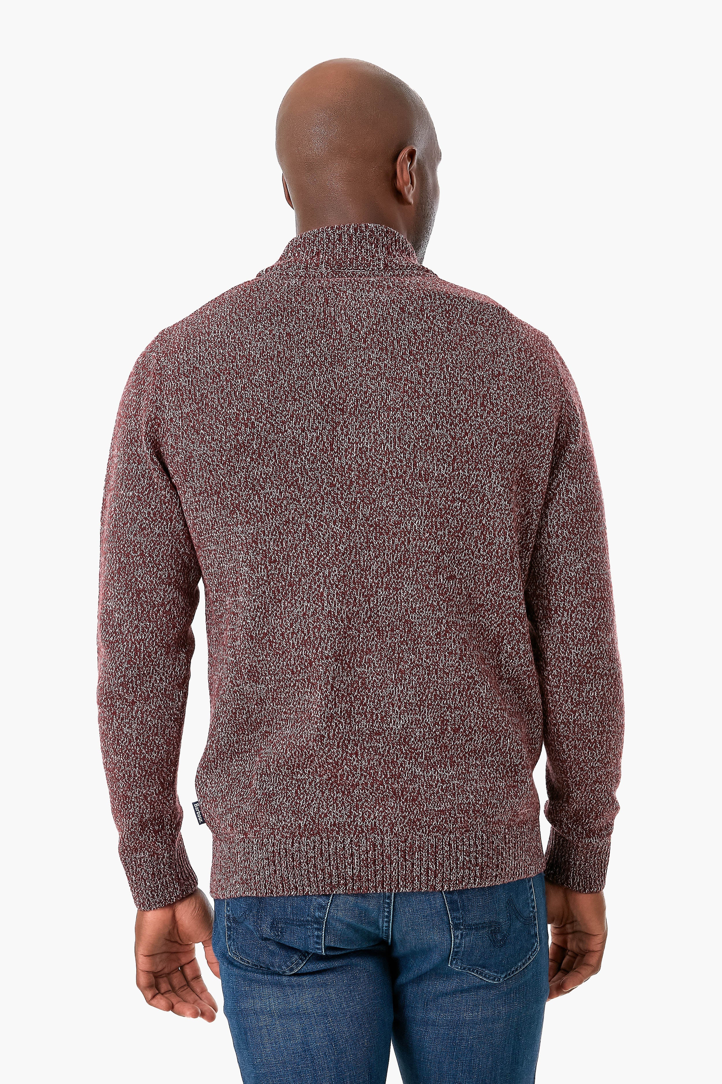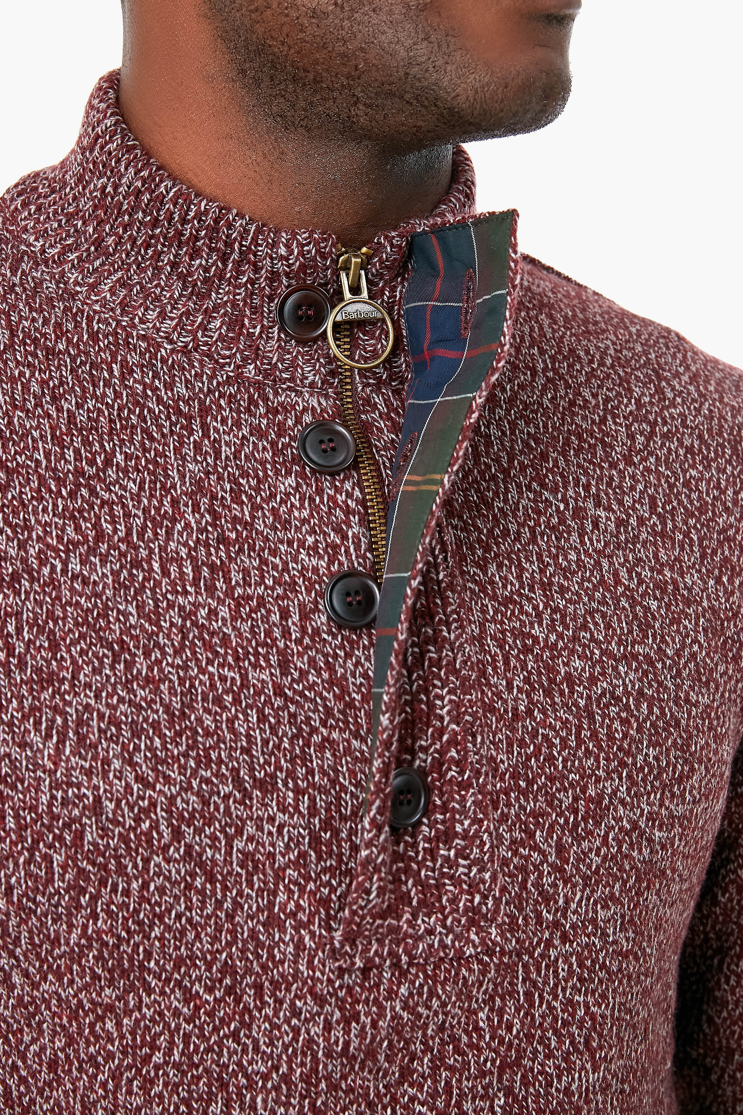 The Crimson Marl Sid Half Zip is a stylish and versatile men's jumper crafted from a luxurious lambswool blend. This warm sweater is the perfect layering piece. Ribbing and a front zip closure with buttons at the neck add subtle yet eye-catching extra details. Pair with a button-down and slacks for a classic look.