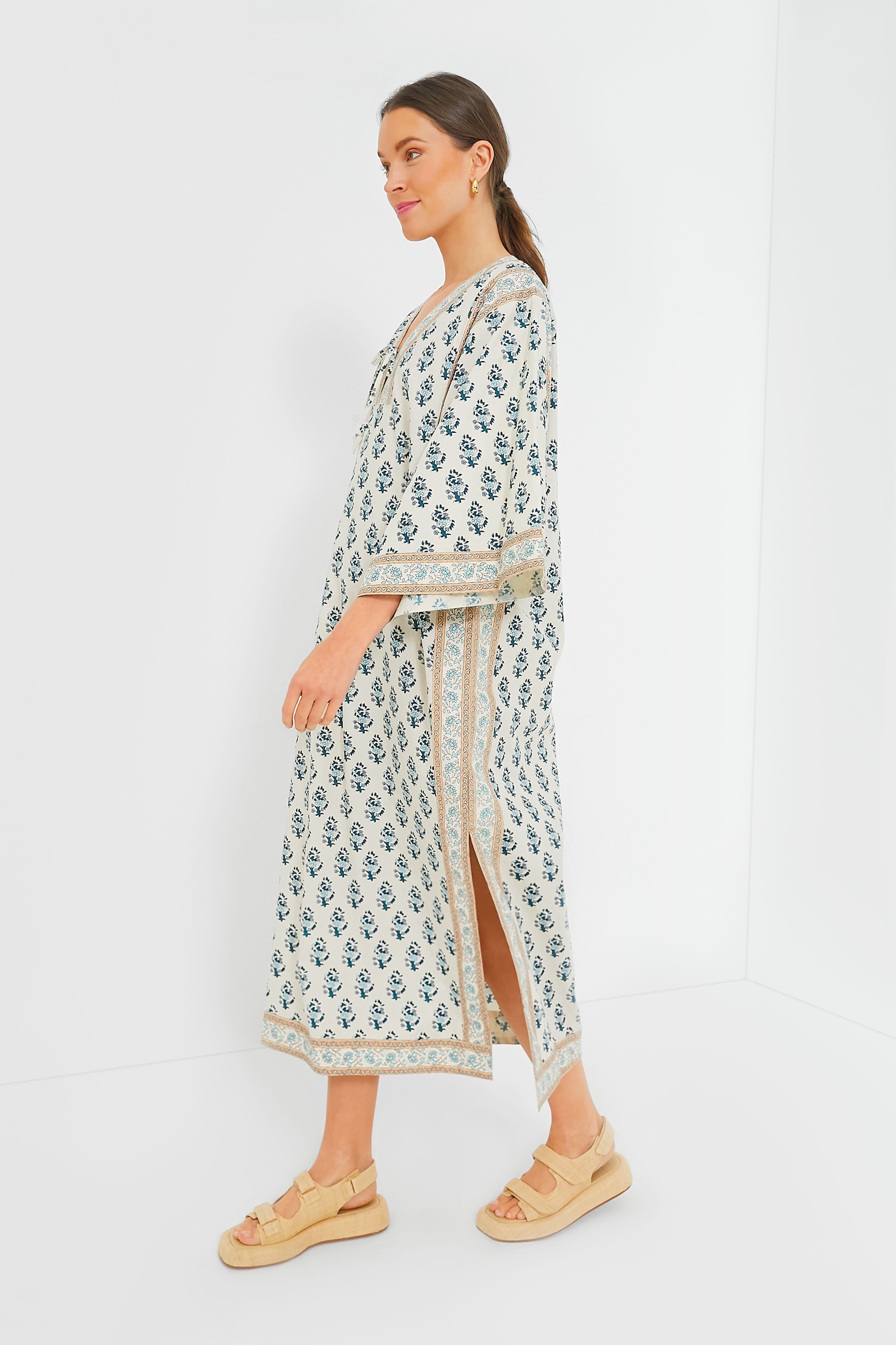 The Dainty Hydrangea Alani Caftan is a sophisticated stunner for your beach days. Featuring three-quarter length flowy sleeves. a V-neckline with a self-tie closure. and side slits for ease of movement. this maxi has everything we love and more. The lightweight cotton is ideal for warm days- simply throw this on over your bathing suit with sandals and you are ready to head out the door!