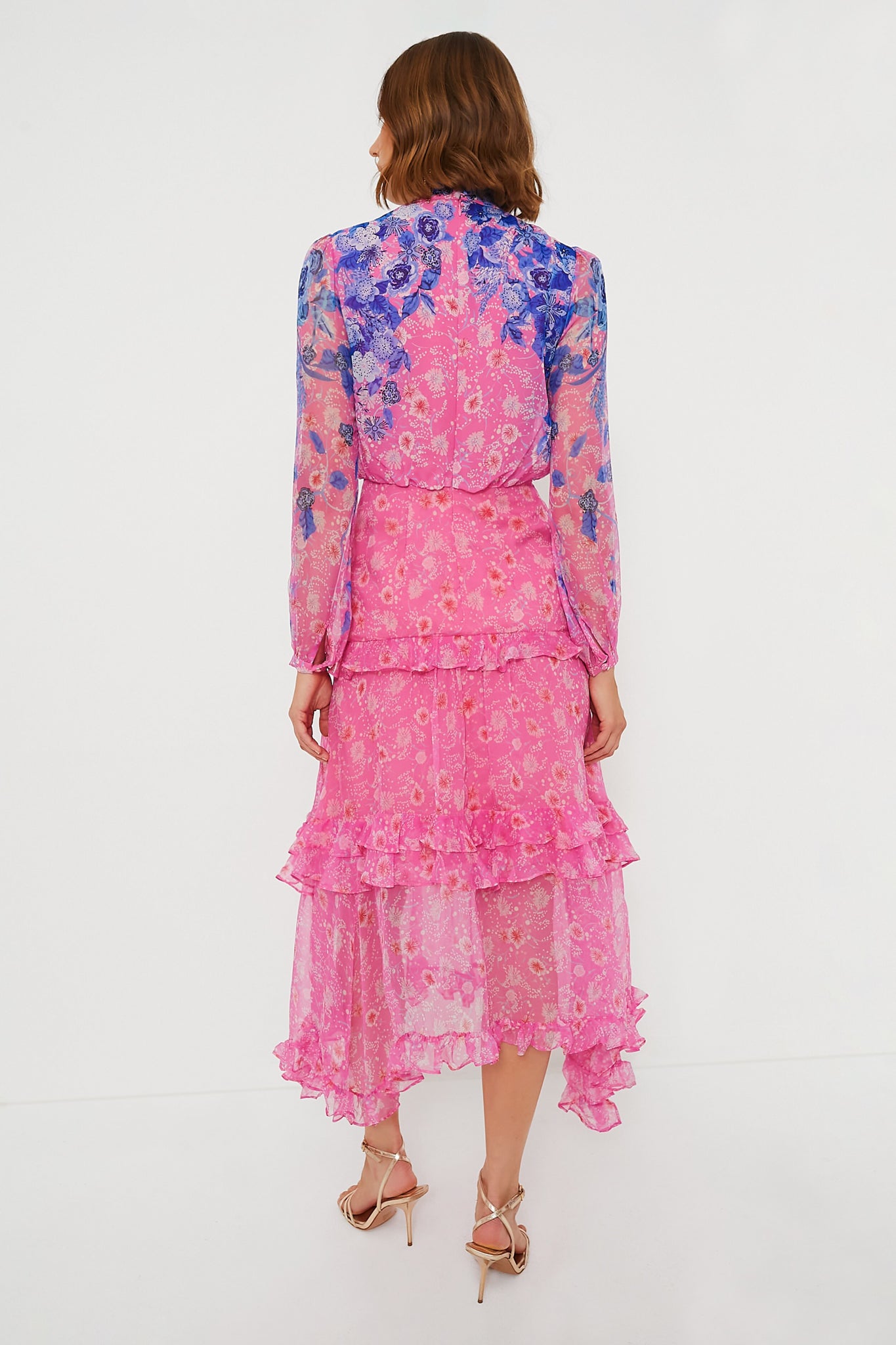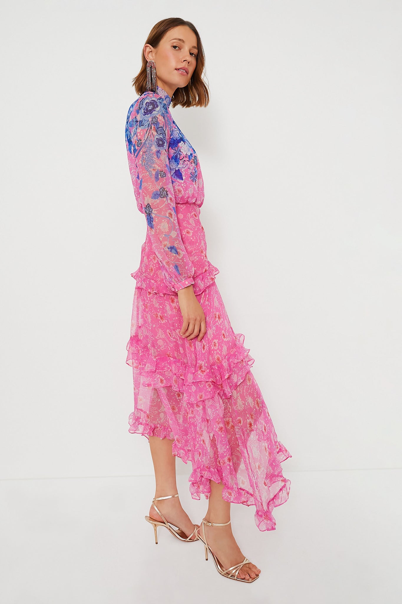 Be a showstopper in the Dandelion Garden Jolie C Dress! Cut from a silky. lightweight chiffon material to create a striking and romantic silhouette with a mock neck. long sleeves. and an asymmetrical flounce hem. this midi is full of movement and cascading ruffles. Style with gold jewelry and a clutch for a look made for a garden party.