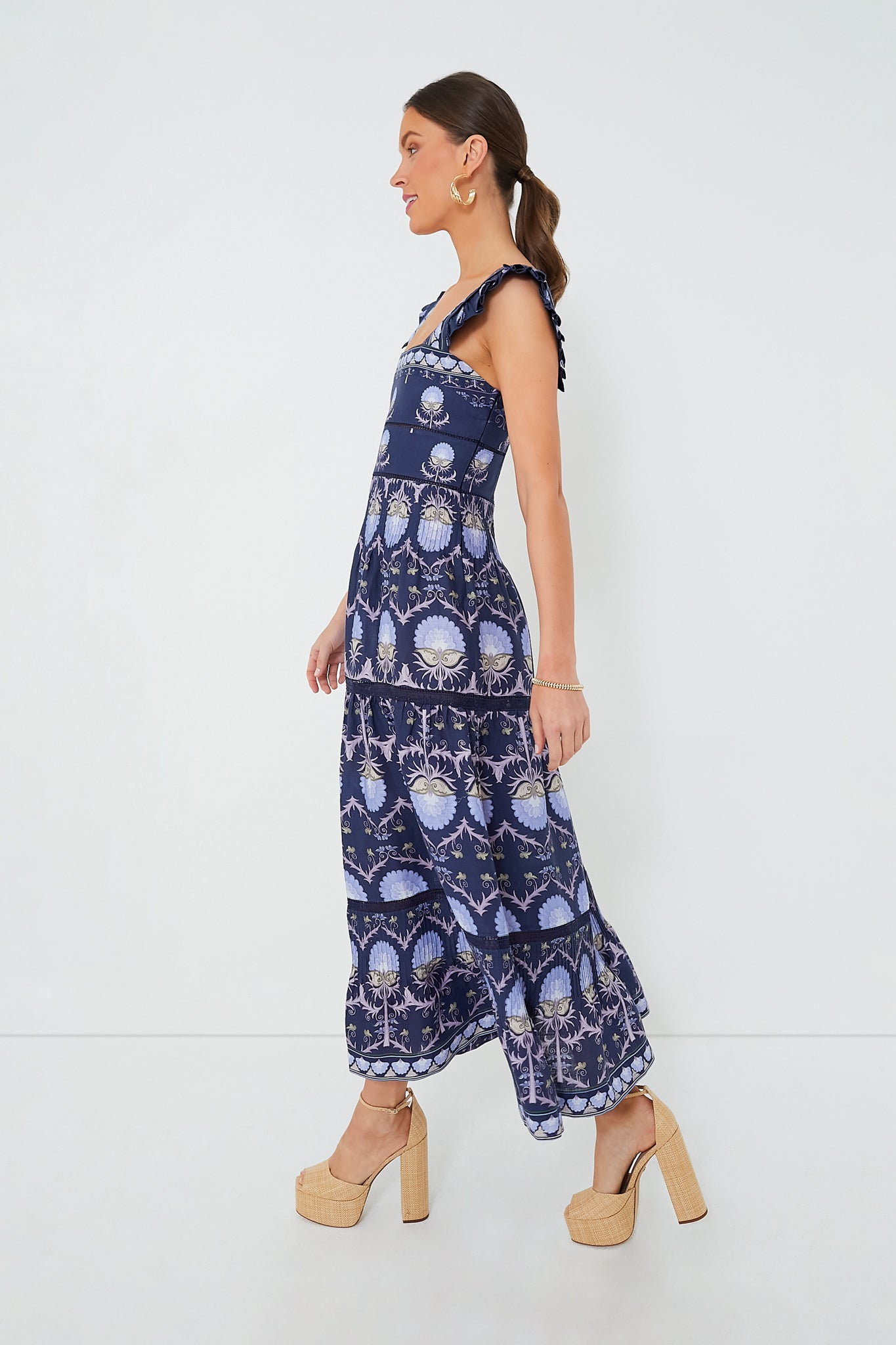 Cut from airy linen fabric. the Dark Blue Sybill Dress is printed allover with a striking square neckline and a corset inspired bodice. With ruffle sleeves. a gathered waistline. and a tiered skirt. this maxi is flattering and perfect for day-to-night. Pair with platform sandals and gold hoops for a brunch or dinner look!