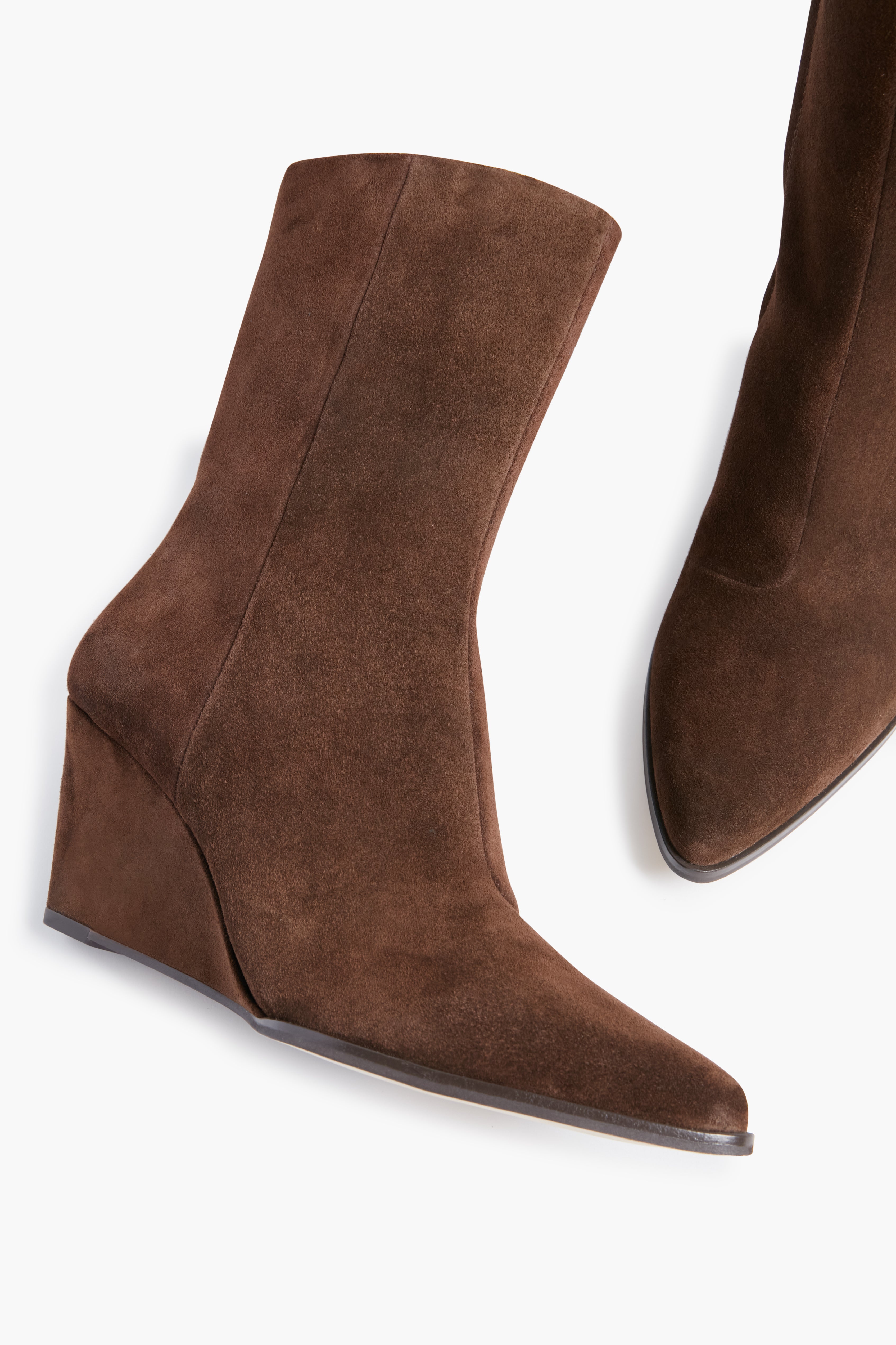 Step out in style with the Dark Brown Suede Gwyneth Wedge Boots! A founder favorite. this classic silhouette has fun details with a wedge heel for comfort and soft. flexible suede for added flair. Sure to be your grab-and-go shoe all season long. pair with jeans by day and pair back to your favorite maxi dress by night.