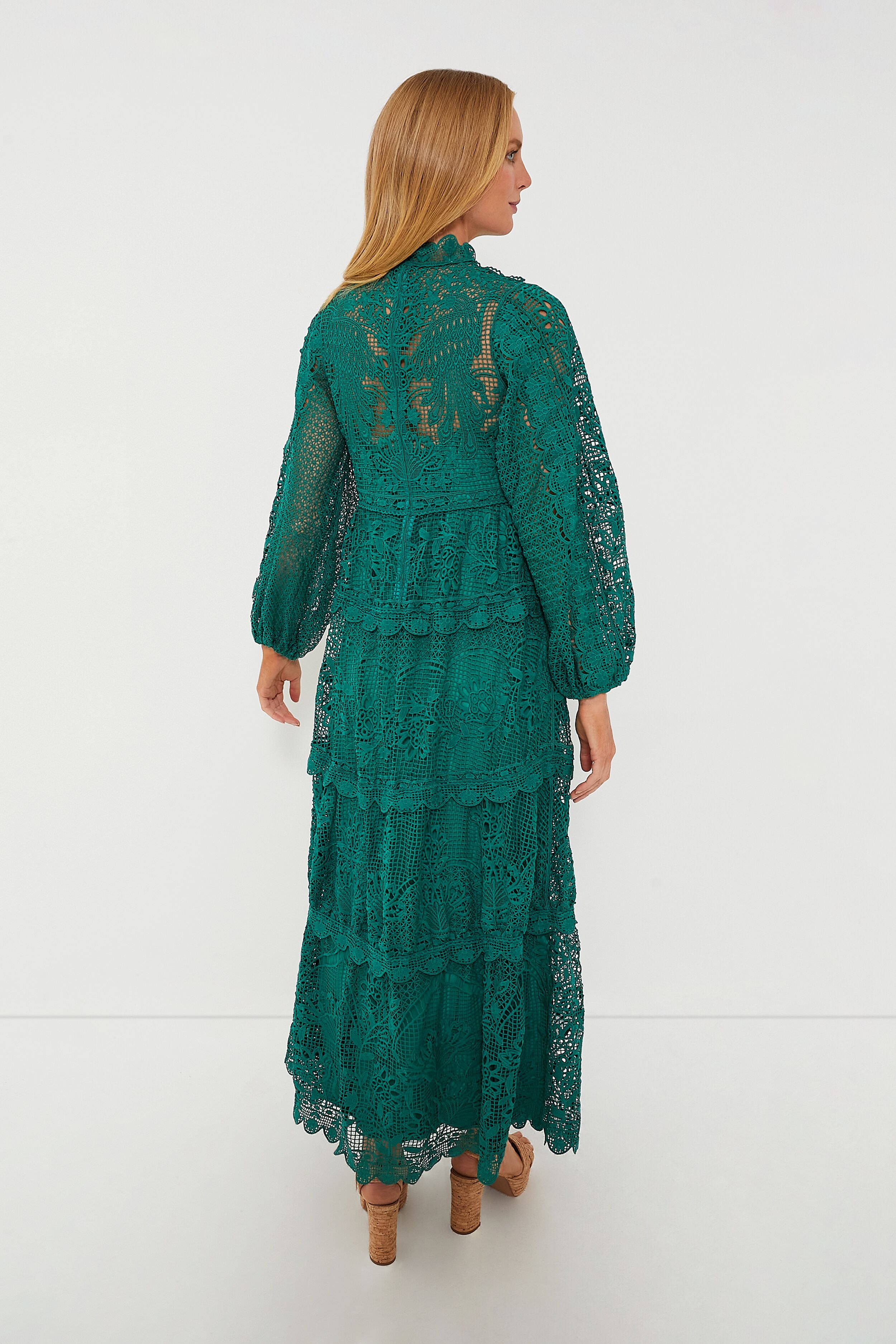 Once you fall for the Dark Green Long Sleeve Dress. you'll always be in love! Cut from guipure lace that's beautifully patterned with delicate flowers and scalloped along the edges. this maxi features blouson sleeves. a flowing tiered skirt and a tonal slip providing the perfect amount of coverage. Turn all moments into memorable occasions. from wedding celebrations to happy hours at the beach. just add heels or sandals for a jaw-dropping look.