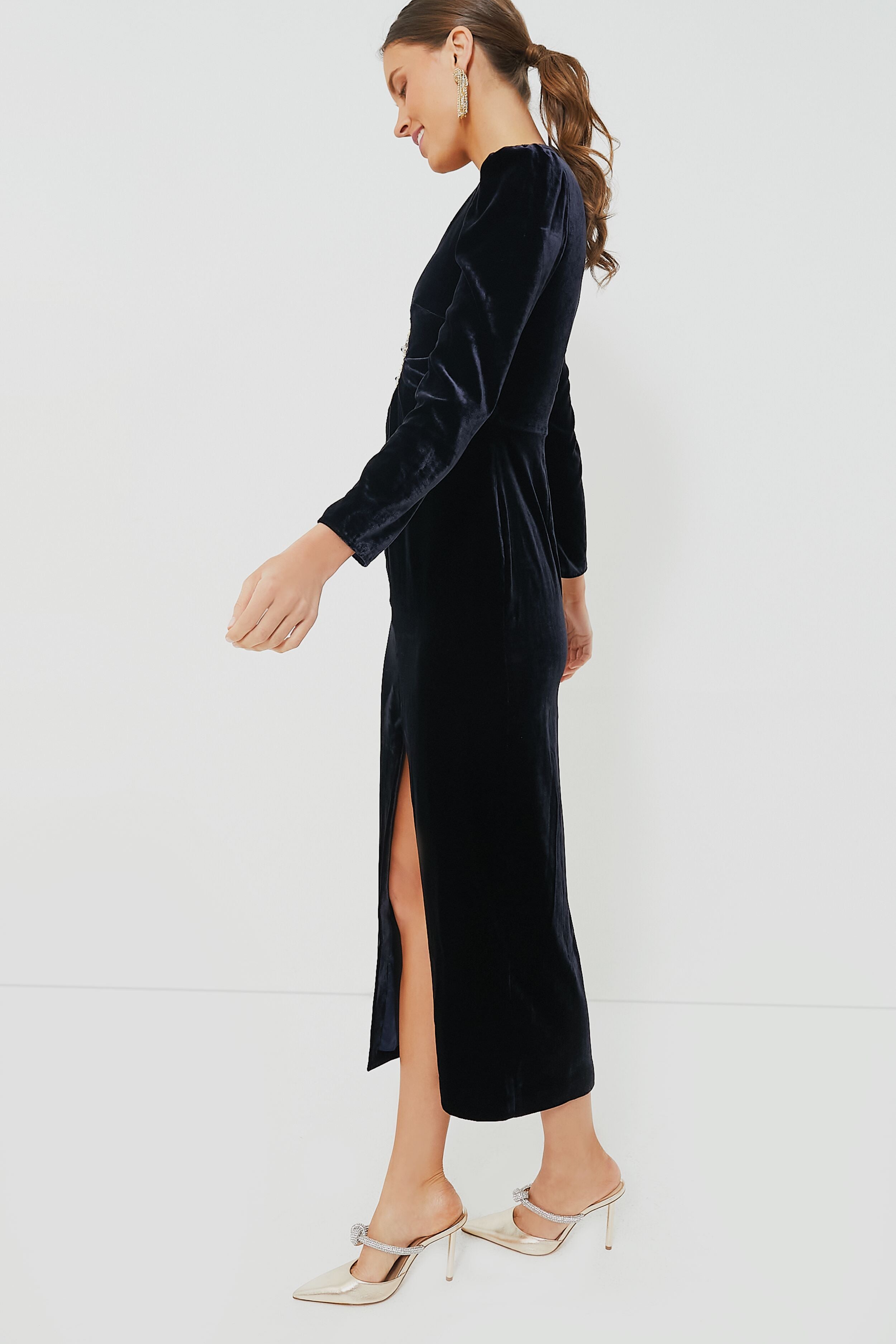 The Dark Navy Sapphire Jinx C Dress is an elegant look for parties and events. A flattering silhouette in rich sapphire velvet is decorated with eye-catching and intricate keyhole threadwork detailing. The front slit and midi length allow your shoes to shine. pair with simple black heels or silver flats!