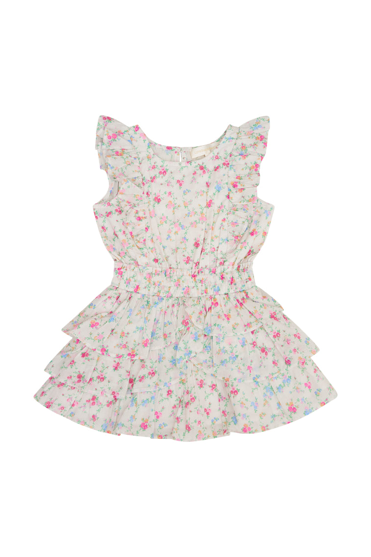 Our best-selling Decker Dress returns for the season with a new rose floral print. This easy frock has a ruffle-trimmed collar. buttons down center front. flutter sleeves. an elastic waist and overlapping asymmetrical ruffles at the skirt.