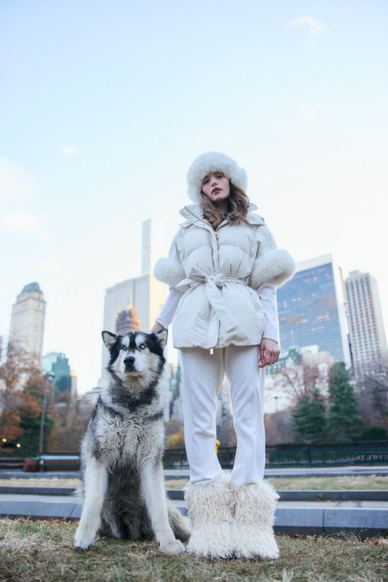 Introducing the Delba Down Jacket from our Go Chicly x MAX&MOI collaboration. This trendy piece of outerwear stuns with short sleeves and a warm. luxe down interior. Removable cuffs designed using MAX&MOI's Furever faux fur adorn the short sleeves giving the outerwear a flirty look. The jacket has an oversized fit. but when tied. the waist belt gives this piece a feminine. and cinched silhouette. A concealed closure beneath a delicate flap and discreet pockets finish this multi-season essential.