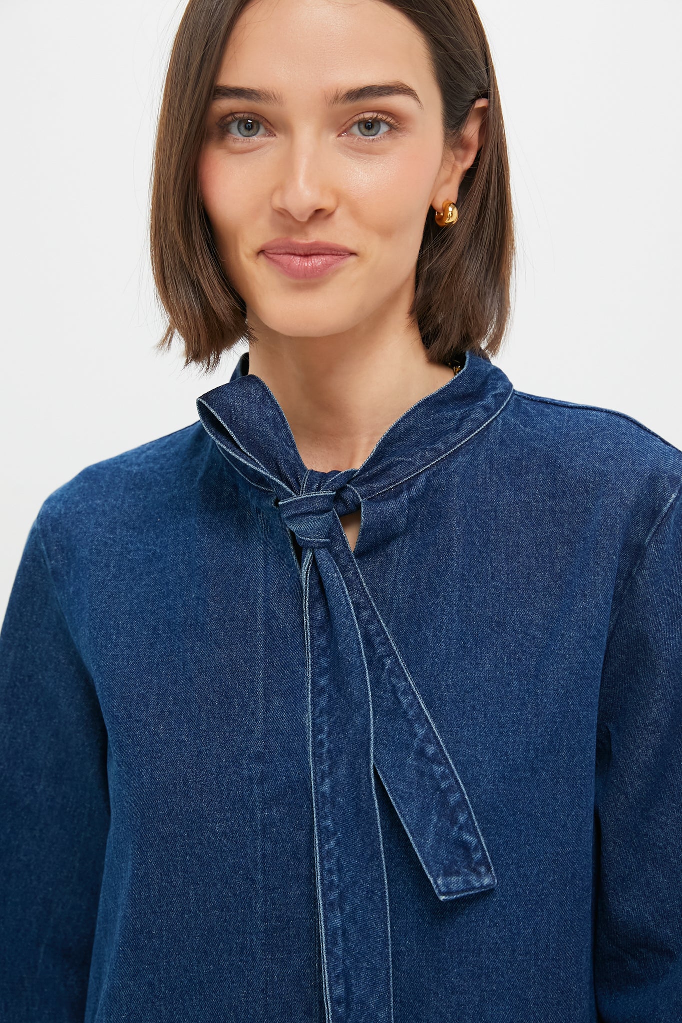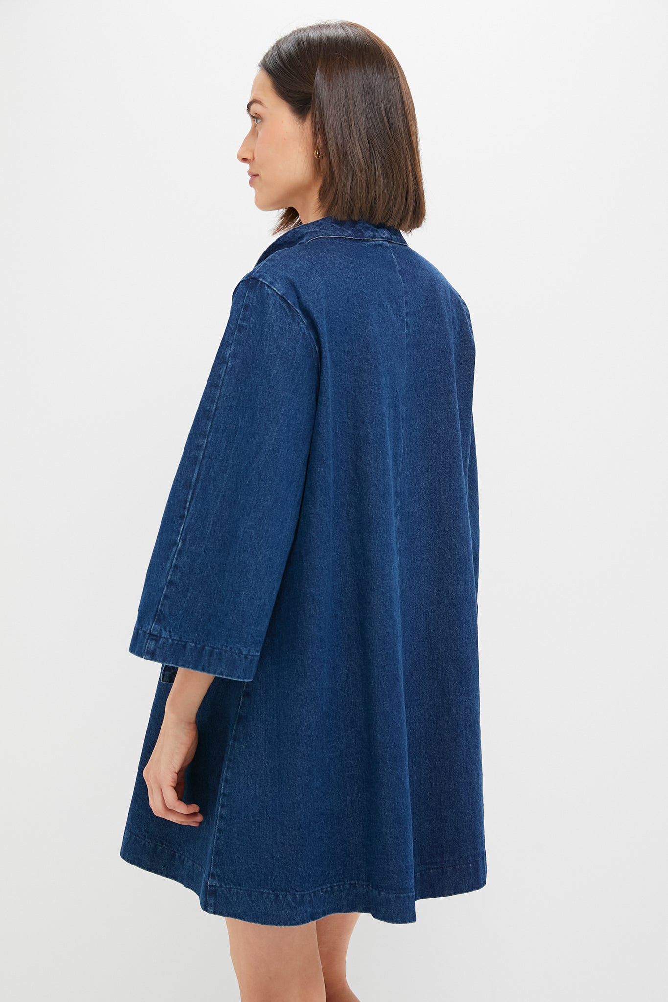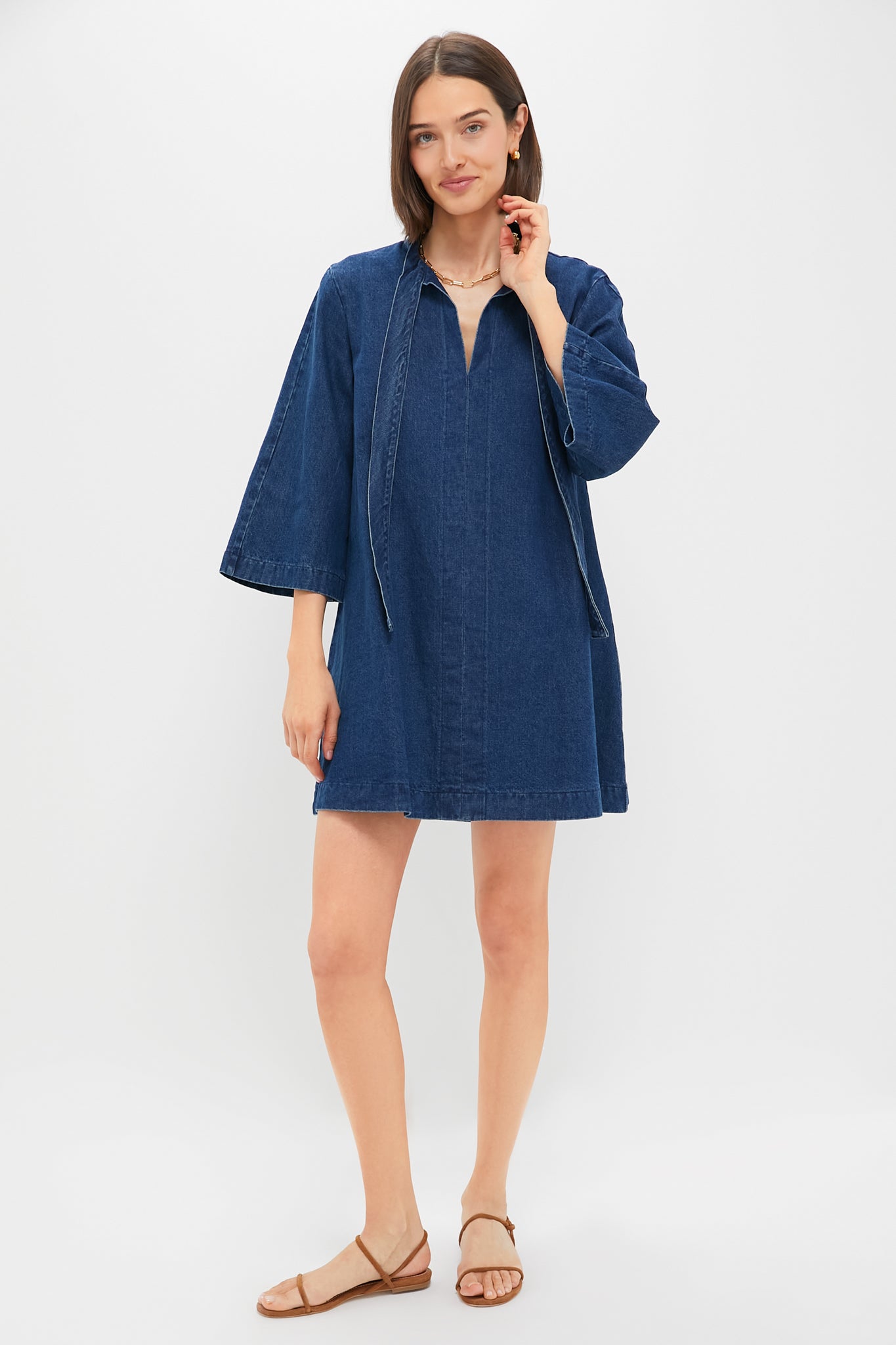 The Denim Marsella Dress is a flattering mini perfect for warm-weather days and events. Boasting three-quarter length bell sleeves. a V-neckline with open ties. and an A-line silhouette. this style is simple and comfortable while still being feminine. Pair with cowboy boots for a western-chic look. or with ballet flats and a tote for strolling around town.