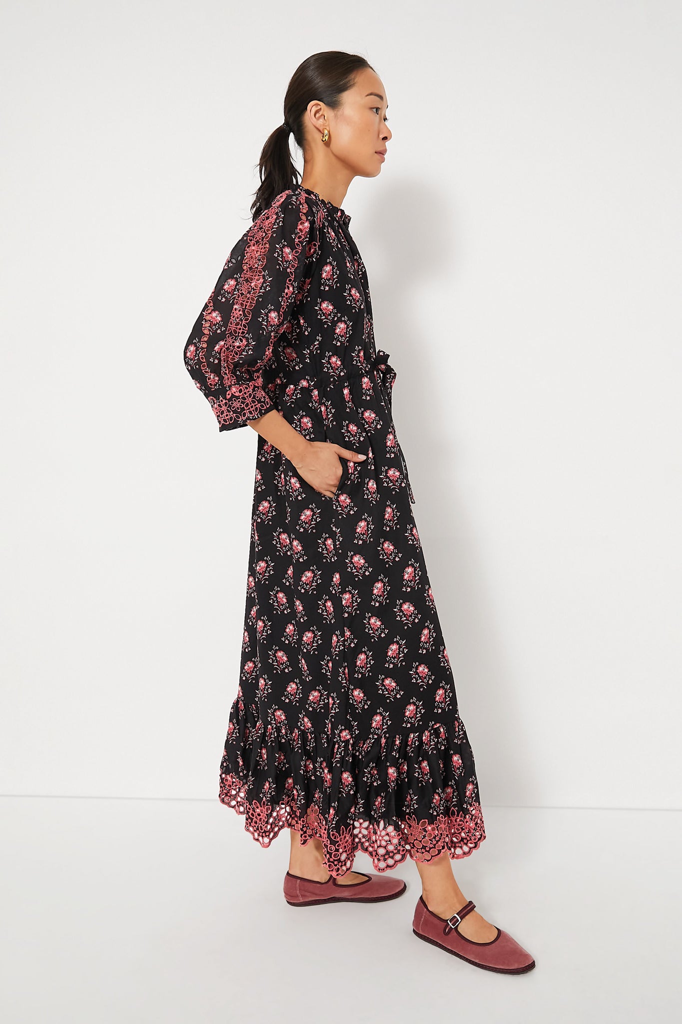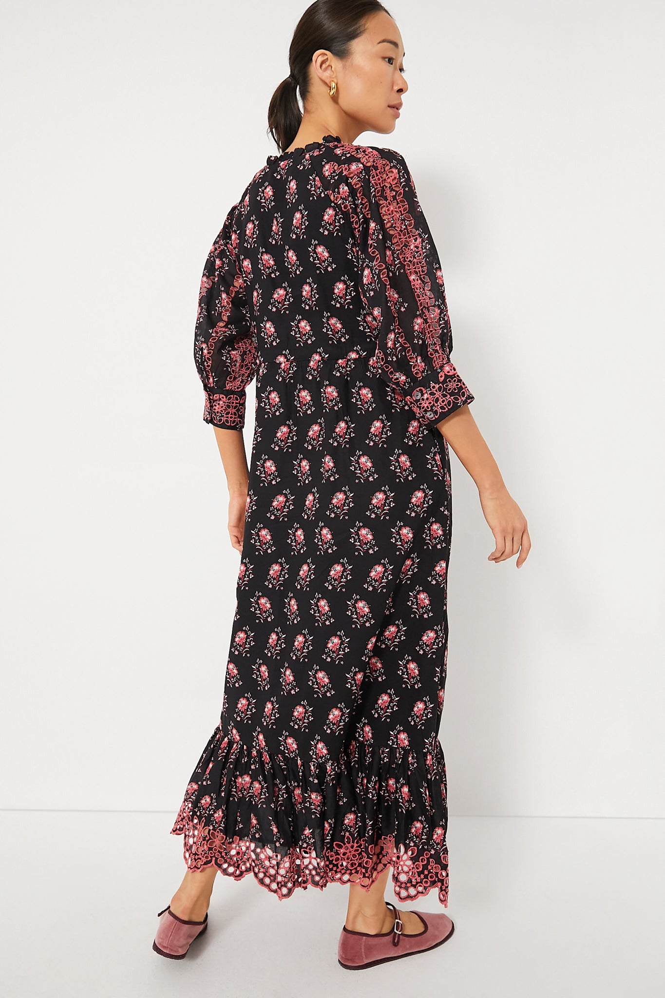 The Dusk Betty Dress is an elegant silhouette with a cinched waist. soft voluminous gathered skirt. and half-length raglan sleeves. Cut from a luxurious cotton cambric with eyelet details and an embroidered scalloped hem. this chic style is perfect for countless events. Pair with boots for an autumnal dinner party. with heels for a wedding. or with ballet flats for an elevated everyday look.