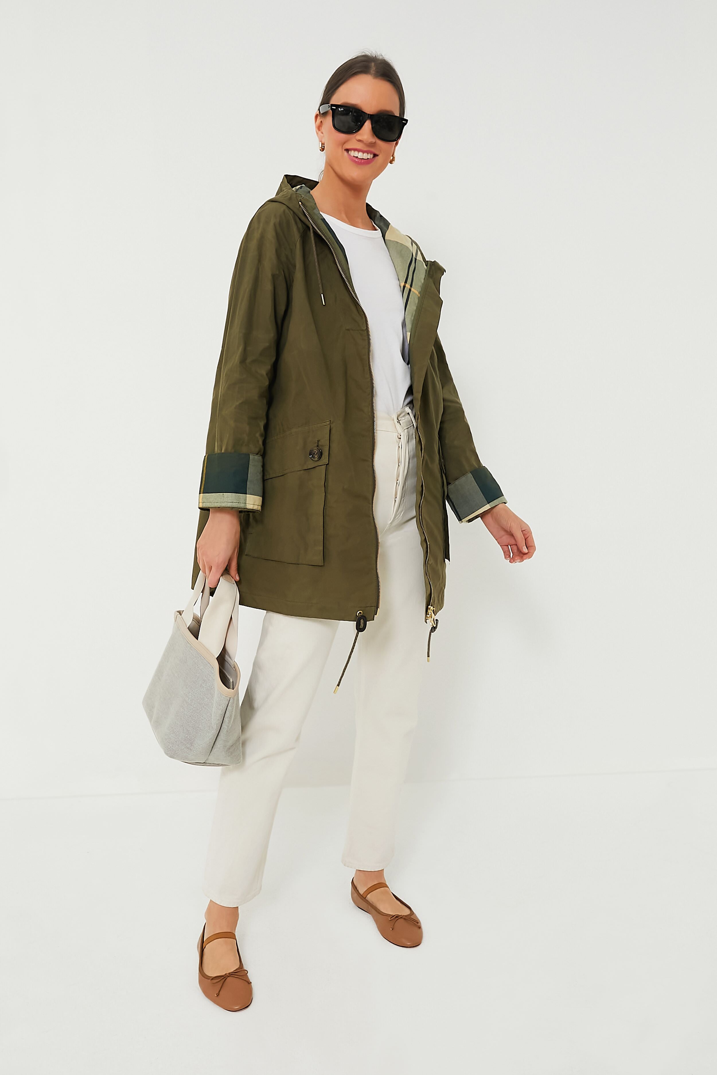 Stay fashionably on-trend with the Dusky Green Keldy Showerproof. This neutral jacket features plenty of functional details that will cause you to reach for it on repeat. including a drawstring hood. oversized pockets to hold your essentials or keep your hands warm. and a tartan-lined interior. To style. just layer it over a cozy sweater. your favorite jeans. and flats for an effortlessly chic look that's perfect for urban commutes and countryside adventures alike.