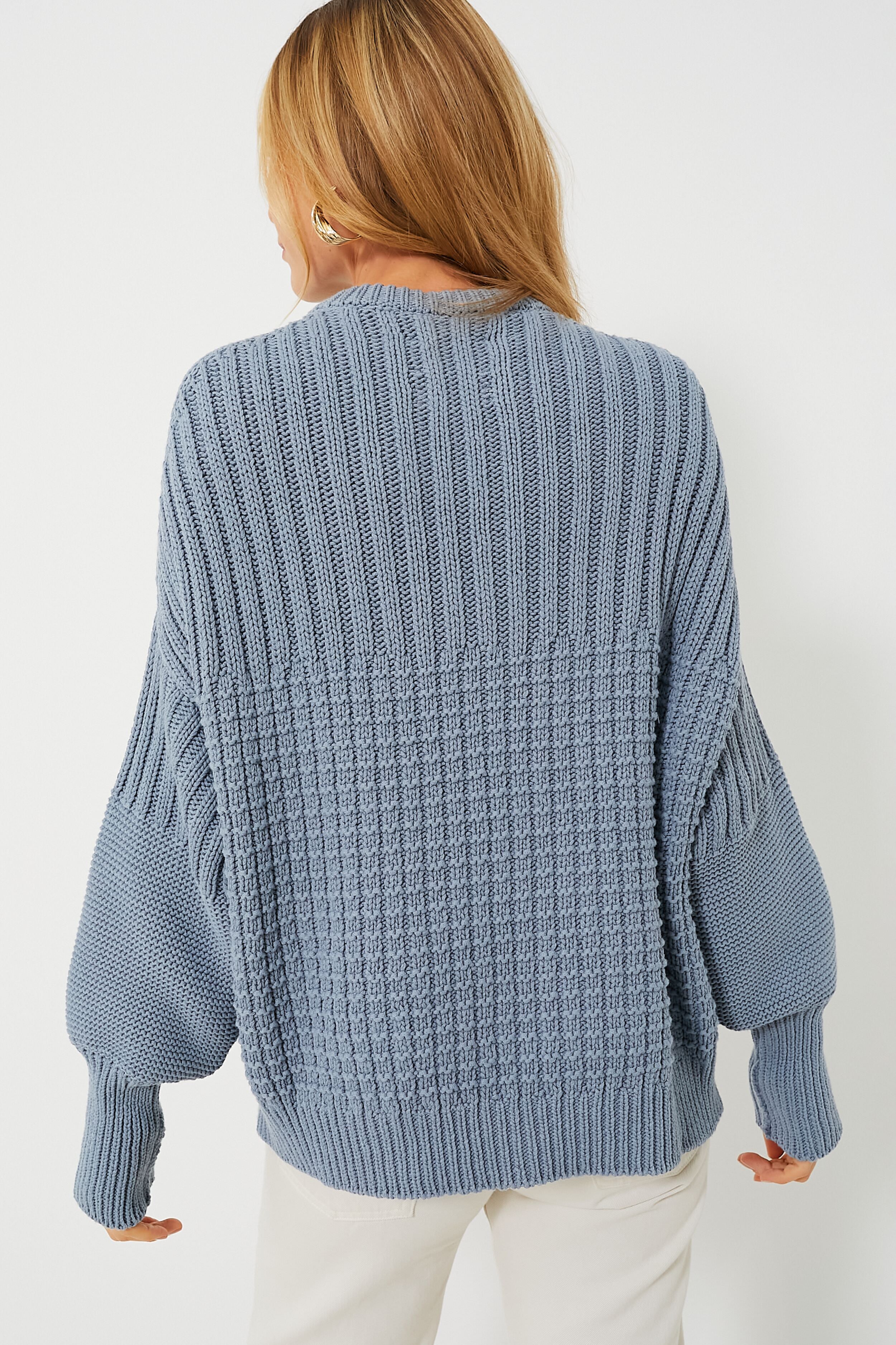 Specially made just for your closet. the Dusty Blue Delcia Sweater is crafted sustainably with care. We adore the unique half-and-half stitching that delivers the perfect touch of texture for a cozy feel. Style this fabulously boxy knit over a slip dress with boots for a dynamic desk to drinks look. or pair with your favorite denim and flats for a classic ensemble.