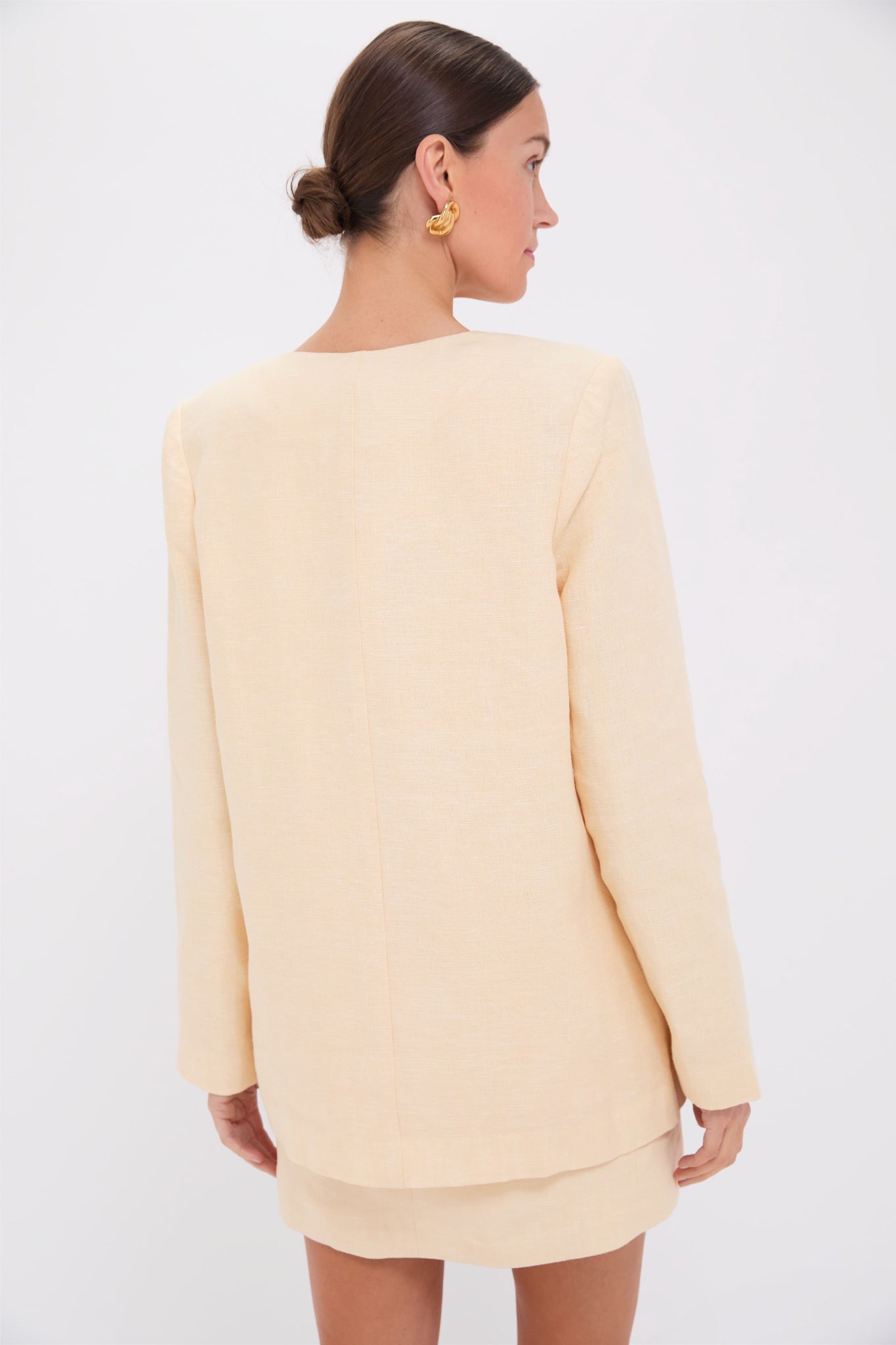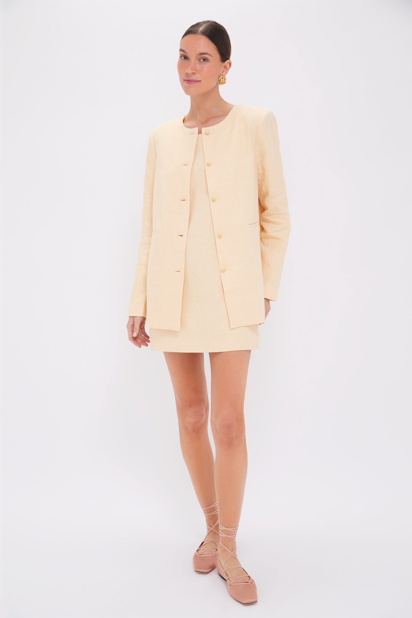 The Rio Jacket is a classic staple you'll cherish for years to come. Tailored from certified linen. padded shoulders frame the boxy silhouette while self-covered buttons extend down the centre front. Wear yours everywhere from the office to date night. We styled it with the coordinating Dusty Citron Rio Mini Dress. a chic ballet flat. and handbag!