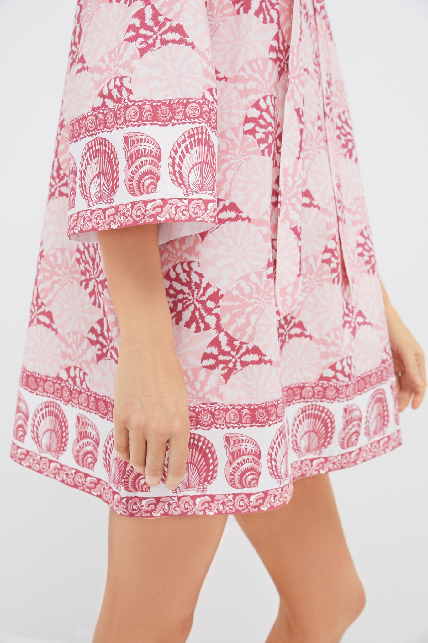 The Dusty Rose Nautilus Shell Marseille Coverup is an effortlessly chic piece to add to your packing list. With a mini length. three quarter length sleeves. and contrast boarder detailing. throw on over a bathing suit for beach-to-bar chic. or wear on its own for a casual Al-fresco dining!