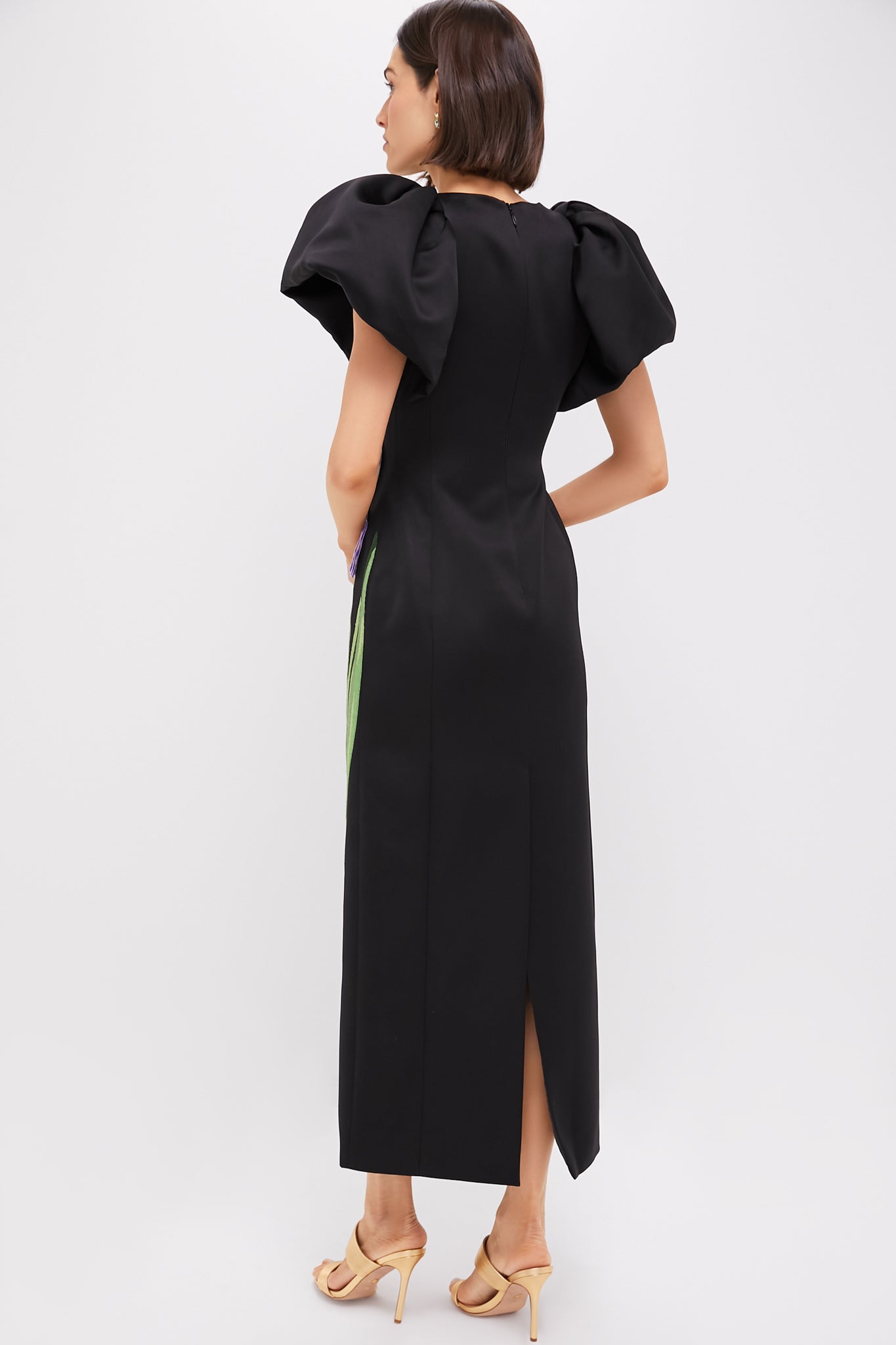 The Ebony Iris Print Lucinda Maxi Dress is a stunning gown for your next black-tie occasion. With organza irises embroidered on an ebony base. this gathered puff sleeve adds a unique shape to this slim silhouette. Perfect for weddings. galas. and other black tie affairs. just add heels and a clutch for a truly breathtaking look!
