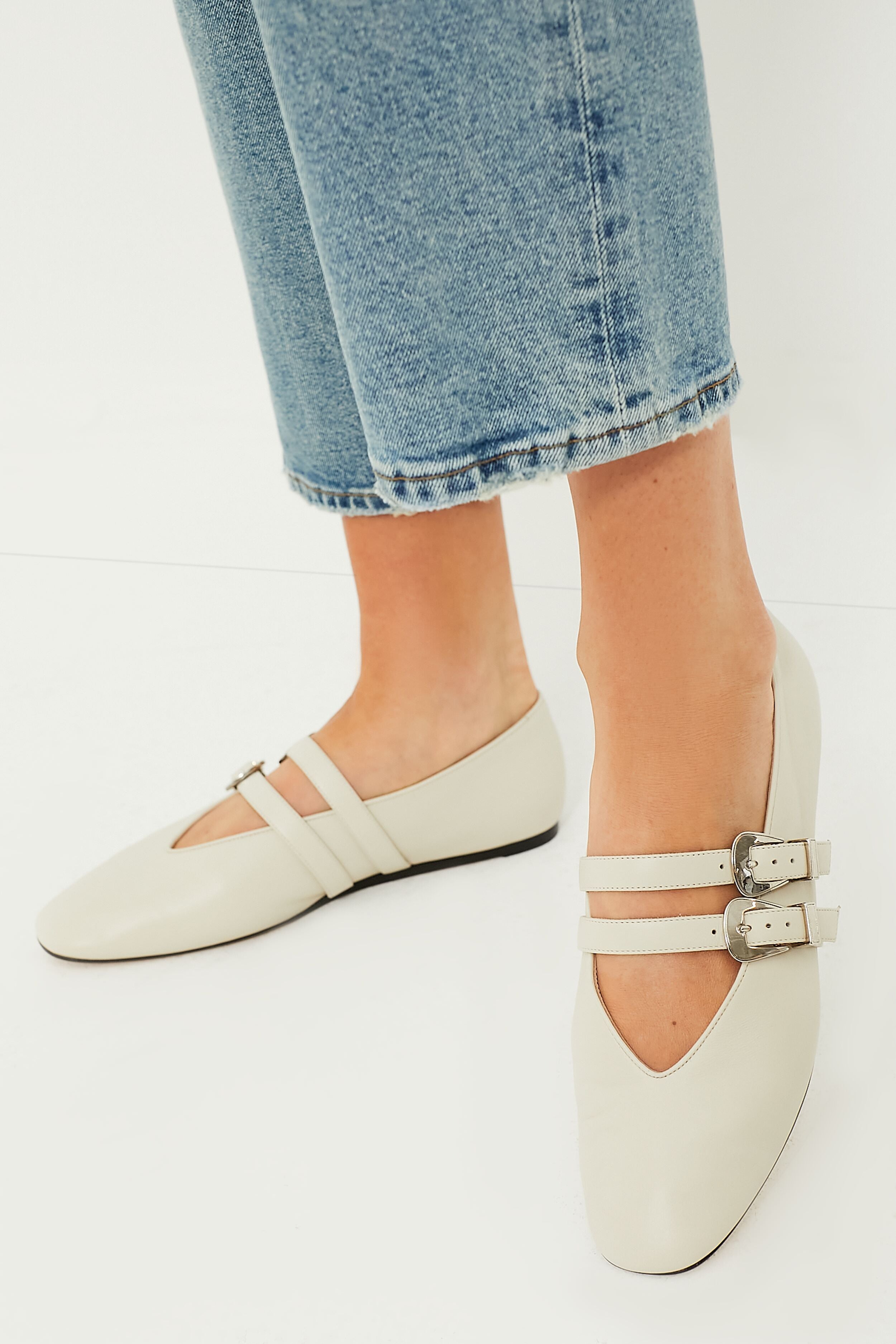 The Ecru Claudia Leather Slippers deliver a sleek silhouette with a hint of edgy flair. Complete with two silver buckled straps. these chic flats feature a almond toe. leather body. and a padded insole for all-day comfort. Pair these classic beauties with denim. trousers. dresses. skirts. and more for an elevated ensemble that is sure to impress.