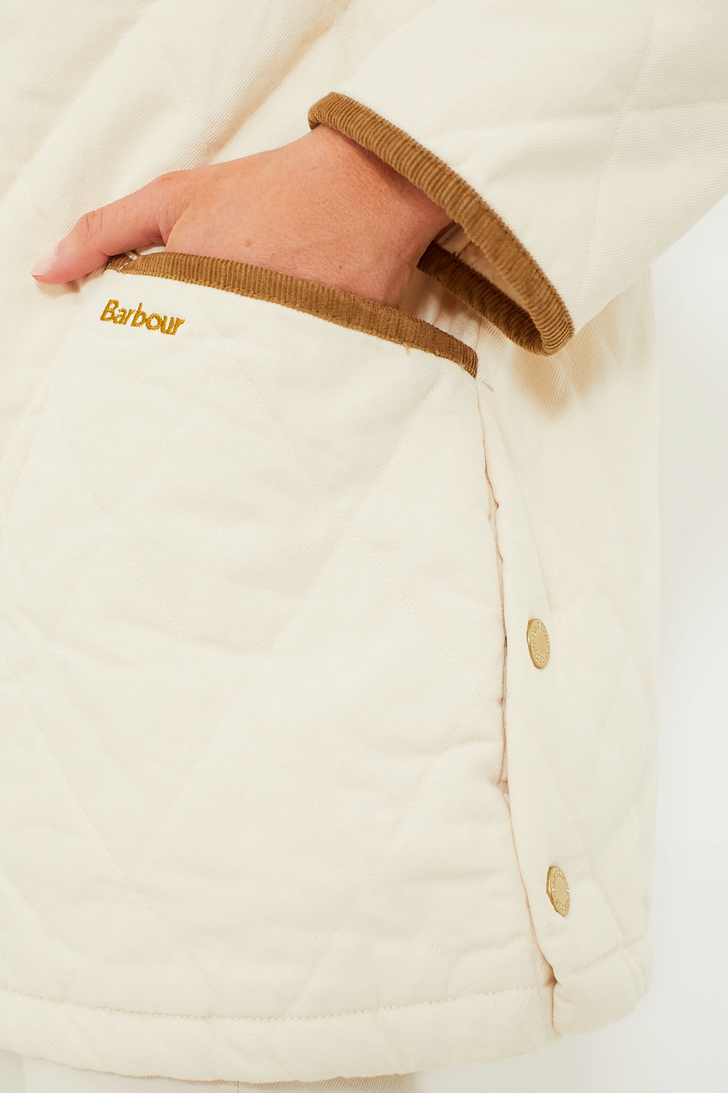 The Ecru Denim Modern Liddesdale offers a contemporary take on an outerwear classic. Boasting a relaxed fit with an oversized cord collar and trims. this quilted silhouette features practical side pockets. gold-tone buttons and complete with a gingham lining for a playful touch of print. Perfect for slightly chilly spring nights in the city or cold football games. we are wearing this piece with denim. boots. and a soft scarf for a stylish yet warm look.