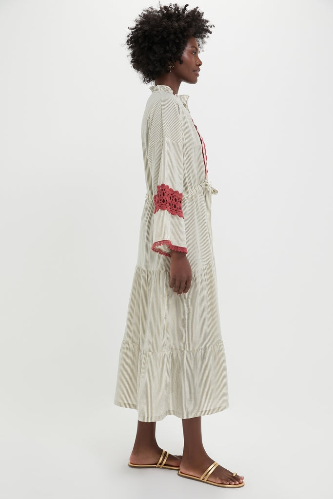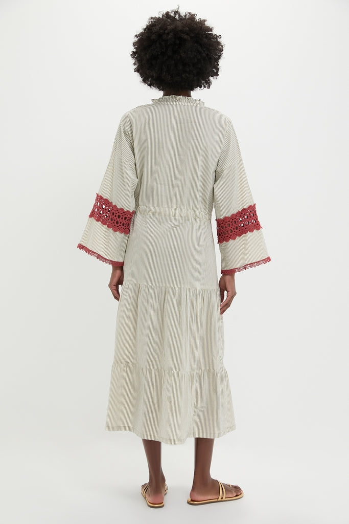 The Embroidered Desert Striped Carmel Caftan is a must-have piece for your warm weather wardrobe. With a relaxed fit. ruffle collar. drop shoulder with a bell shaped sleeve. and a self-tie waistband. this caftan is sure to please. The neutral stripe and contrasting lace detailing add an elevated touch. Throw on over a bathing suit. with sandals. and sunnies. or with wedges and a clutch for Al-fresco evenings.