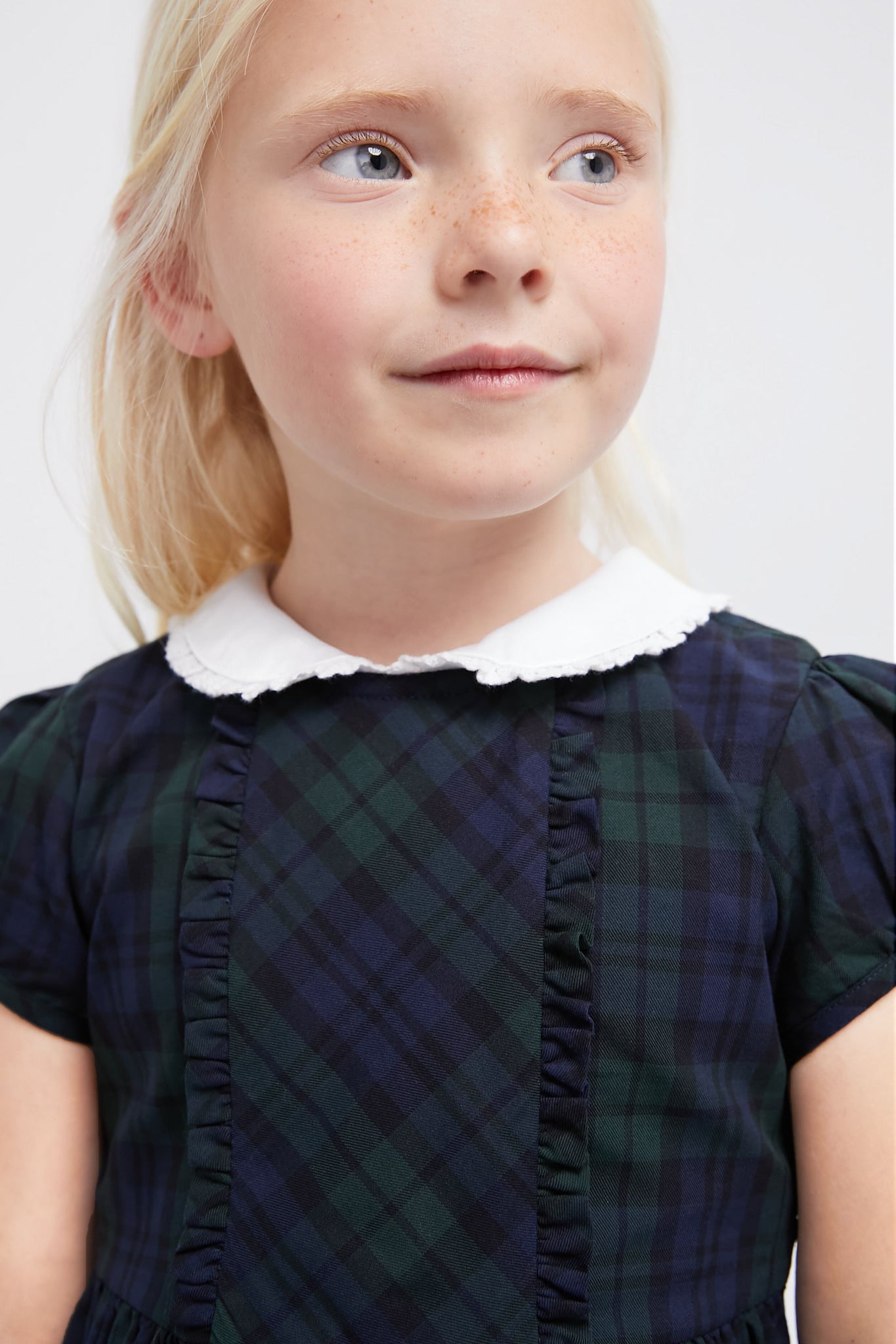 This sweet frock features short puff sleeves. a peter pan collar. and frills across the front bodice and collar. With a sash tie at the back. it's perfect for any holiday outing - from school to parties and family gatherings. your little one will look and feel their best in this mini!