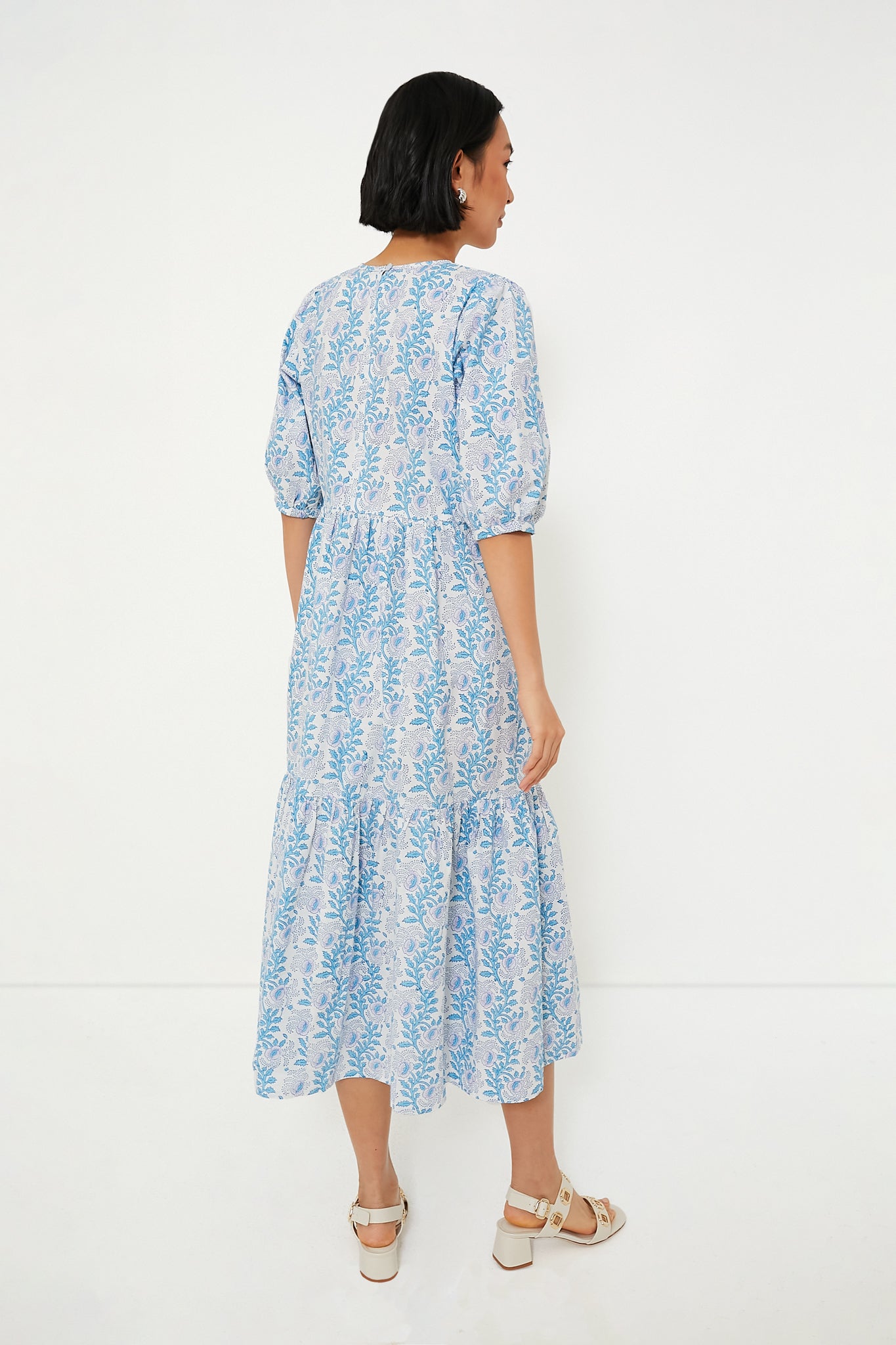 We are loving the soft and easy feel of the Exclusive Lavender and Cornflower Blue Gaia Dress. The cool blue and purple pattern is soothing and elegant. and SZ Blockprint's thick cotton allows for durability for years to come. With an exaggerated puff sleeve for a bit of flair. we are pairing this look with white platform sandals and earrings for an effortless all-day outfit.
