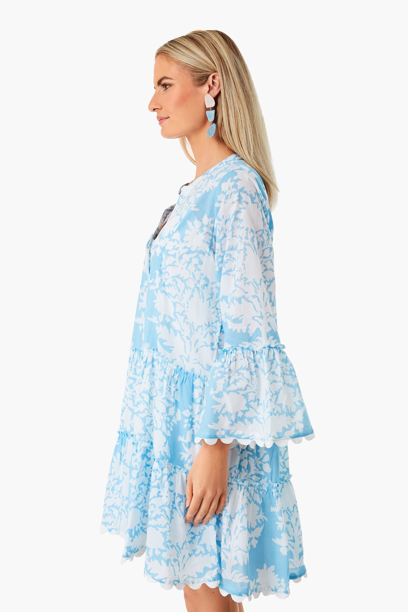 A Go Chicly exclusive. the Pastel Blue Palladio Flared Sleeve Dress is made from a vibrant floral block print. Inspired by the Bar Palladio in Jaipur. India. this blouson mini is finished with ric rac trim to create a scalloped hem and sleeve detail. Pair with wedges and a tote for an easy. sun-seeker look!