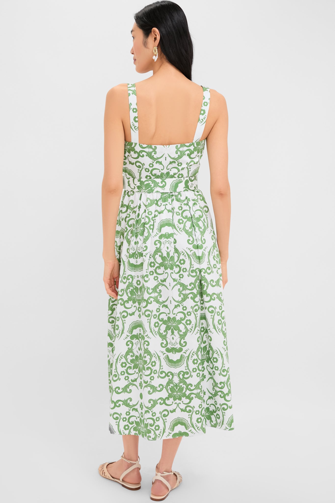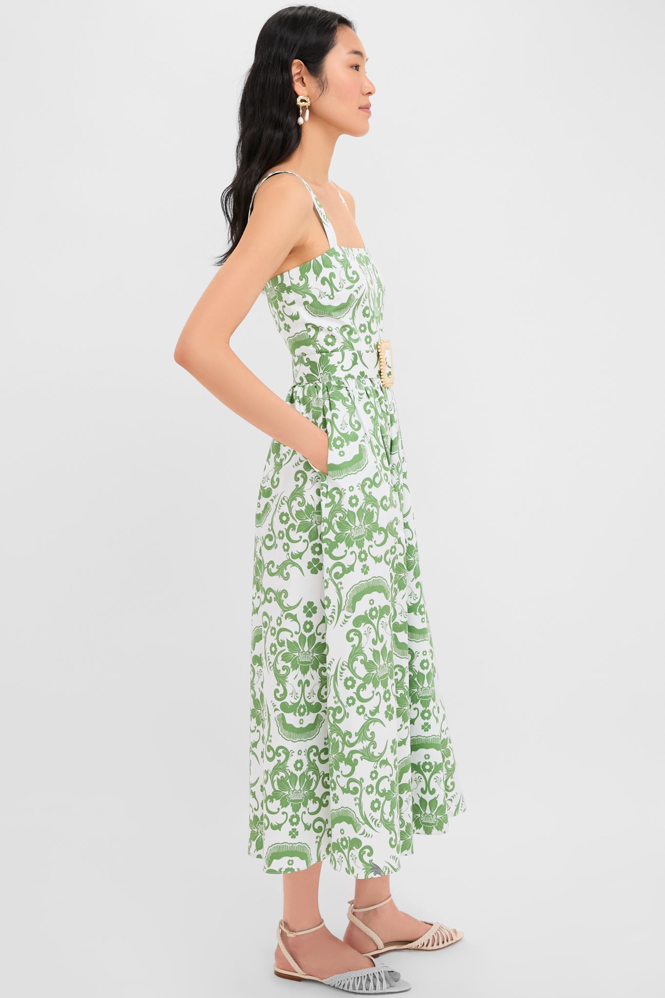 The Exclusive White and Green Ninet Dress features a flattering waist belt. a whimsical pattern. and a flattering fit and flare silhouette. This midi transitions seamlessly from day to night. style it with ballet flats for a relaxed daytime vibe or pair it with heels and clutch for a polished evening ensemble.