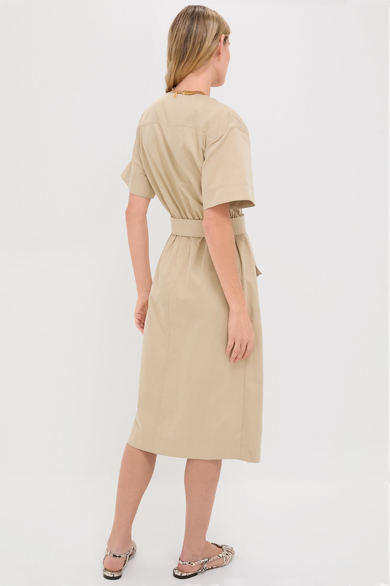 The Fawn Twill Carine Dress is the type of style that you can wear to any and every occasion. With a front button placket. adjustable waist belt. and four front patch pockets. this utilitarian-inspired midi will pair well with ballet flats. sneakers. heels. and beyond!