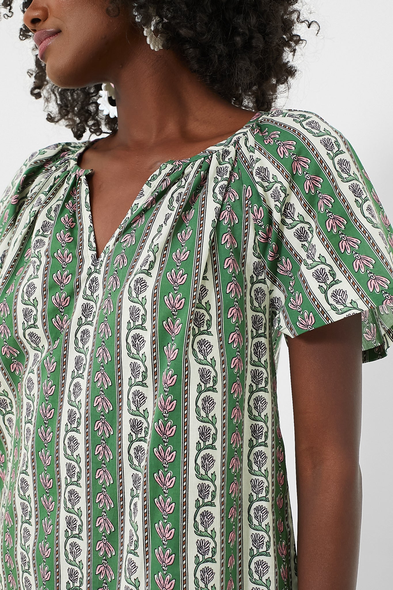 Perfect for summer picnics or spring coffee dates. the Fern and Floral Stripe Elena Top is an adorable style that is incredibly versatile. This top boasts a V-neckline. short flutter sleeves. and an eye-catching floral pattern. Wear with denim and sneakers. or with the matching Fern and Floral Stripe Jolie Shorts for a show-stopping set.