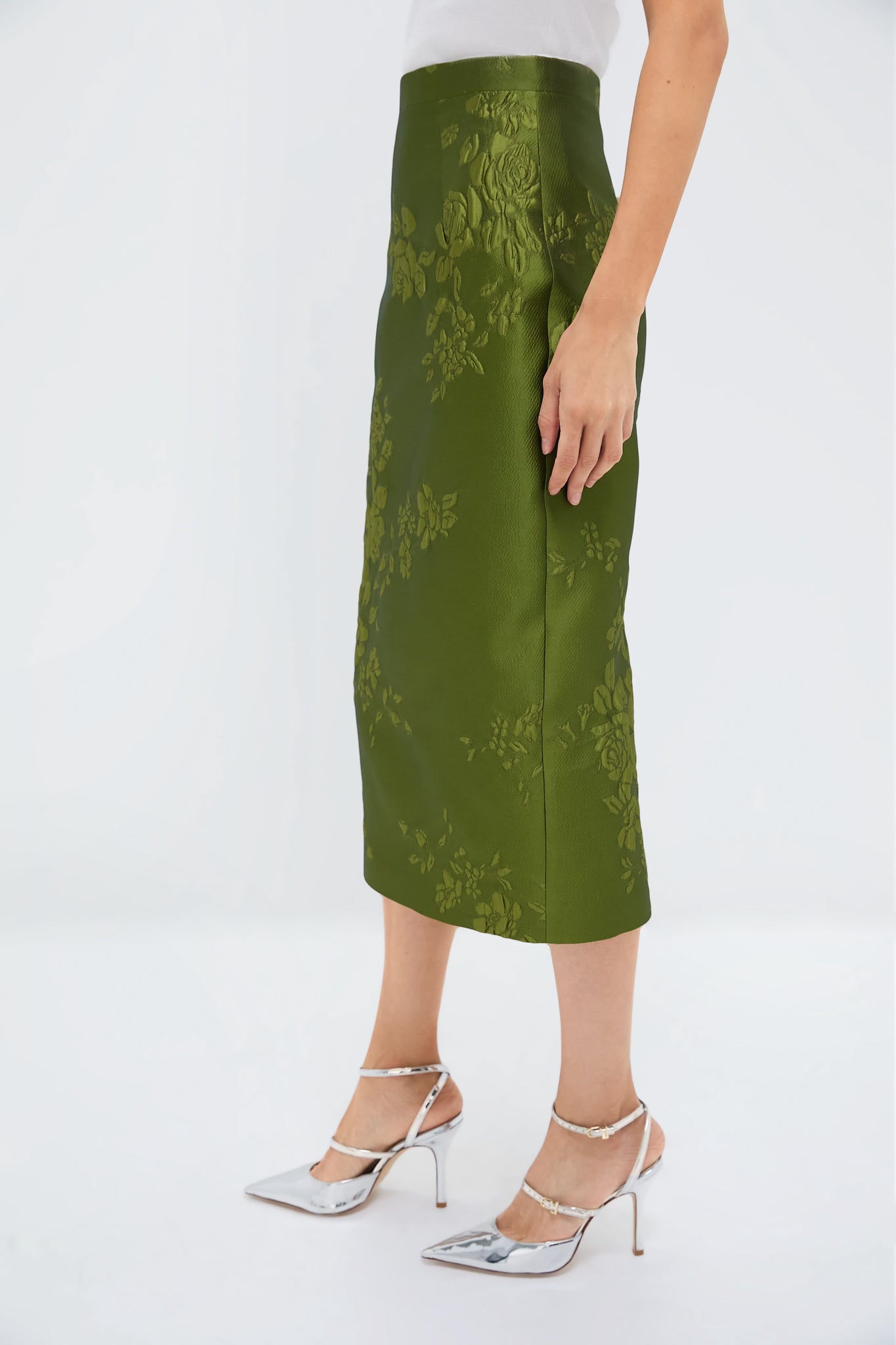 The Fern Green Lorelei Graphic Rose Skirt merges timeless elegance with a bold. textured design. Crafted from luxurious jacquard. this pencil skirt features an embossed graphic rose motif that adds depth and sophistication. The rich fern green hue enhances its modern appeal. while the high waistband and back vent ensure a flattering fit and ease of movement. We recommend pairing with the matching Green Combey Wool Jumper. heels. and a clutch for a chic. monochromatic look!