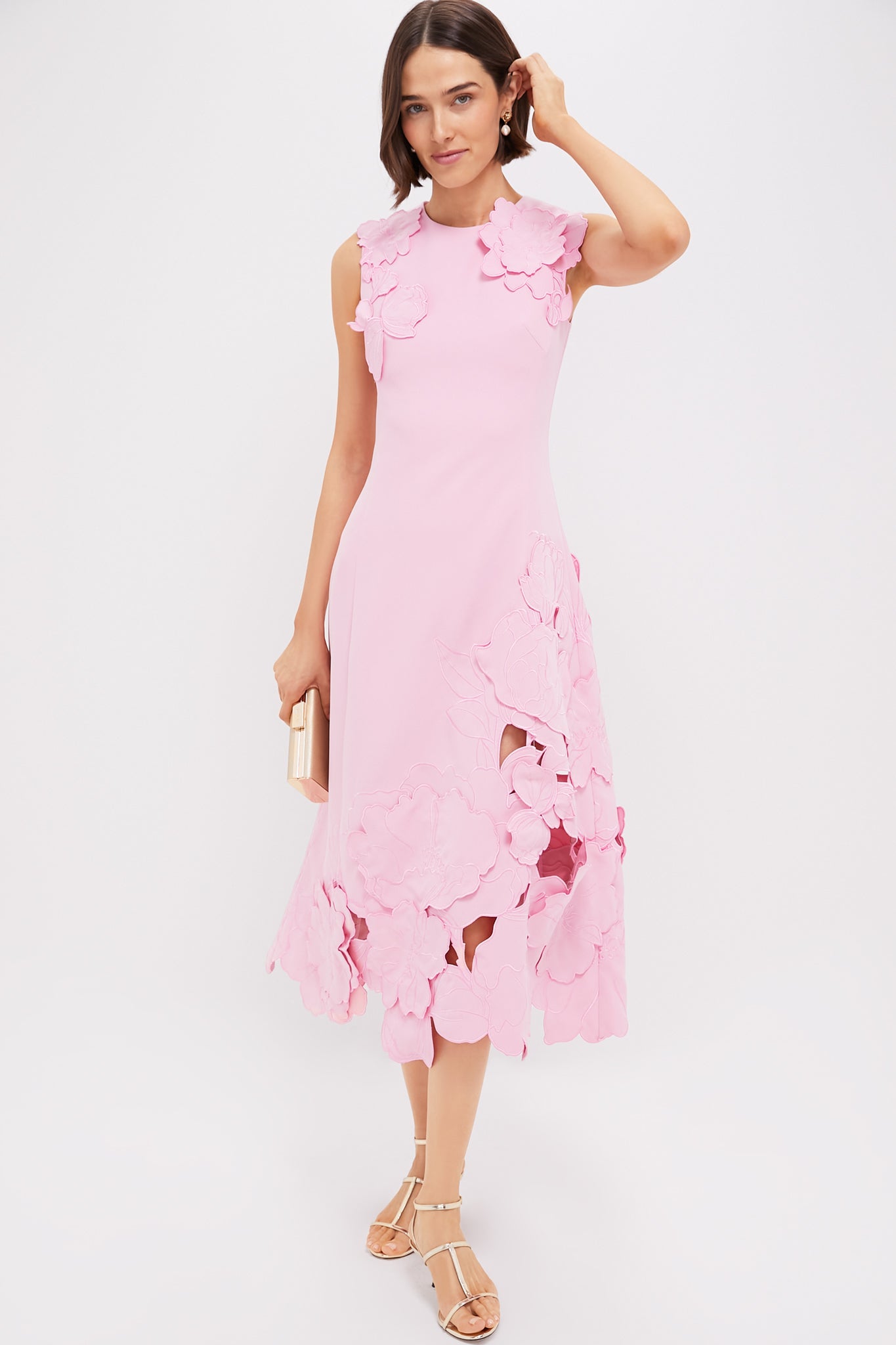 The Flamingo Cleo Dress boasts a beautiful pink color. with stunning floral applique detailing. This unique and show stopping dress is perfect for weddings. galas. and other special black-tie occasions. Pair with gold jewelry. a clutch. and gold heels for a chic and stylish event look!