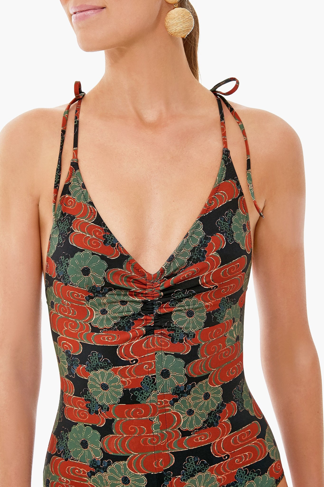 The Forest Cloud Floral Printed Dali Maillot is crafted from beautiful printed Italian fabric. This one piece creates a flattering silhouette with a plunging v-neckline. ruched center front seam. and adjustable shoulder ties. Pair with a hat and sunglasses for days spent soaking up the sun!