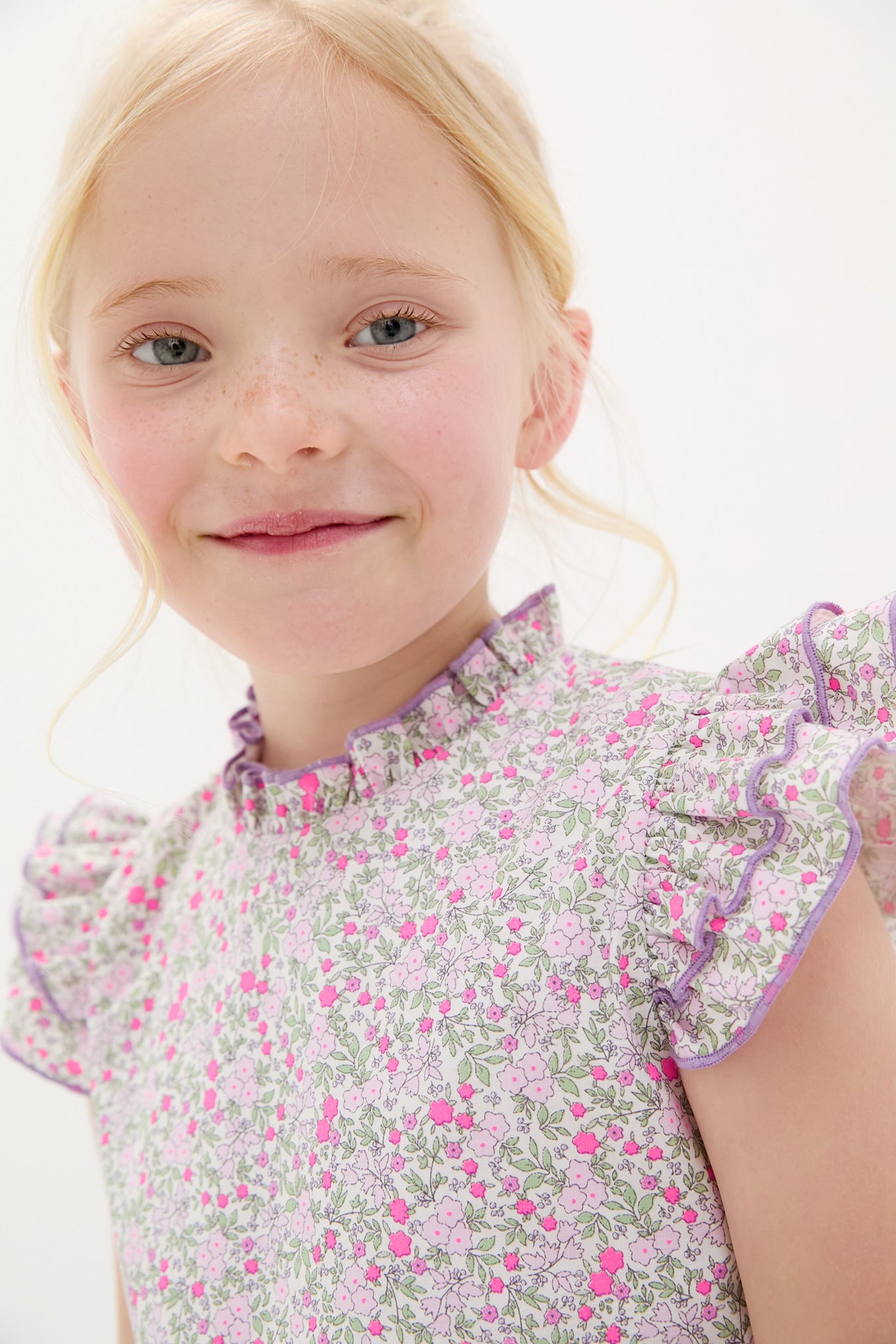 The Fuschia Floral Filomena Dress is beautifully decorated with disty florals in shades of pink. green and purple. and crafted from soft organic cotton poplin with a dropped waist and a softly pleated skirt. With a relaxed. boxy fit. a rounded neckline with a frill finish and tiered butterfly sleeves delicately trimmed with contrasting piped embroidery. The perfect piece for garden parties and special events. it can easily be dressed up or down depending on the occasion.