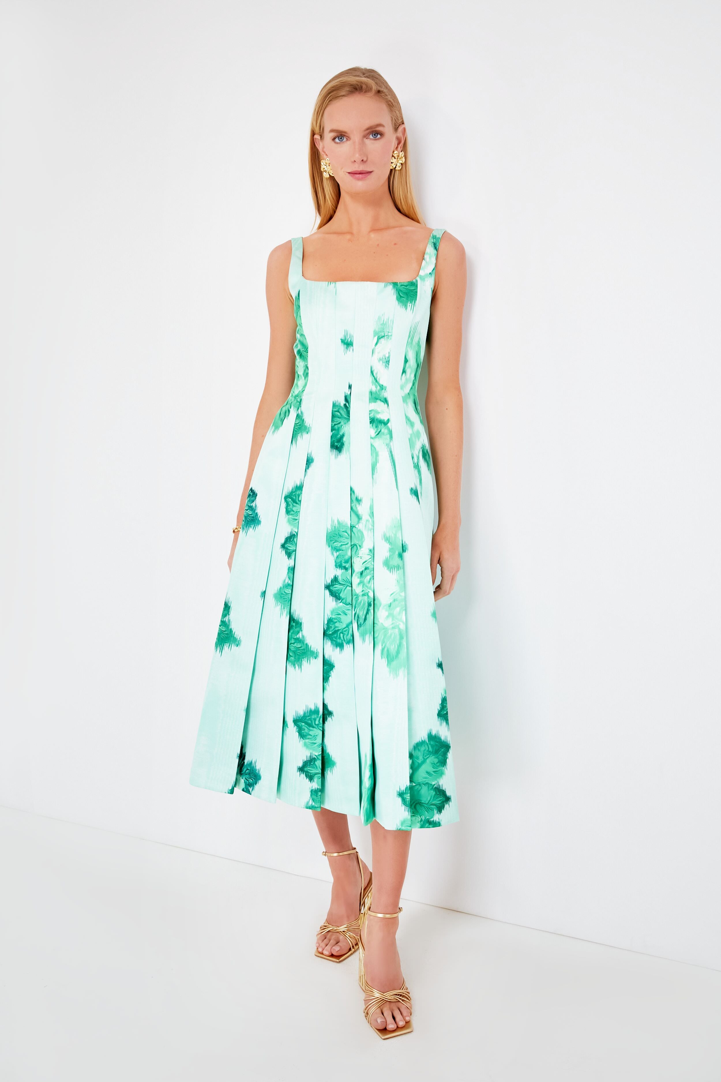 Take your classic fit-and-flare style. refine it with sculptural details. add a rich emerald hue. and you get the Giant Moire Adele Dress. Truly statement-making. the elegant rose print is equally glamorous and effortless. This midi features a paneled construction that's designed to accentuate the waist and create a soft. feminine silhouette – then fall down into a beautiful skirt that has a jaw-dropping effect when you twirl. Add gold accessories and a clutch and you're all set for summer weddings. showers. and any other event on your social calendar this season.
