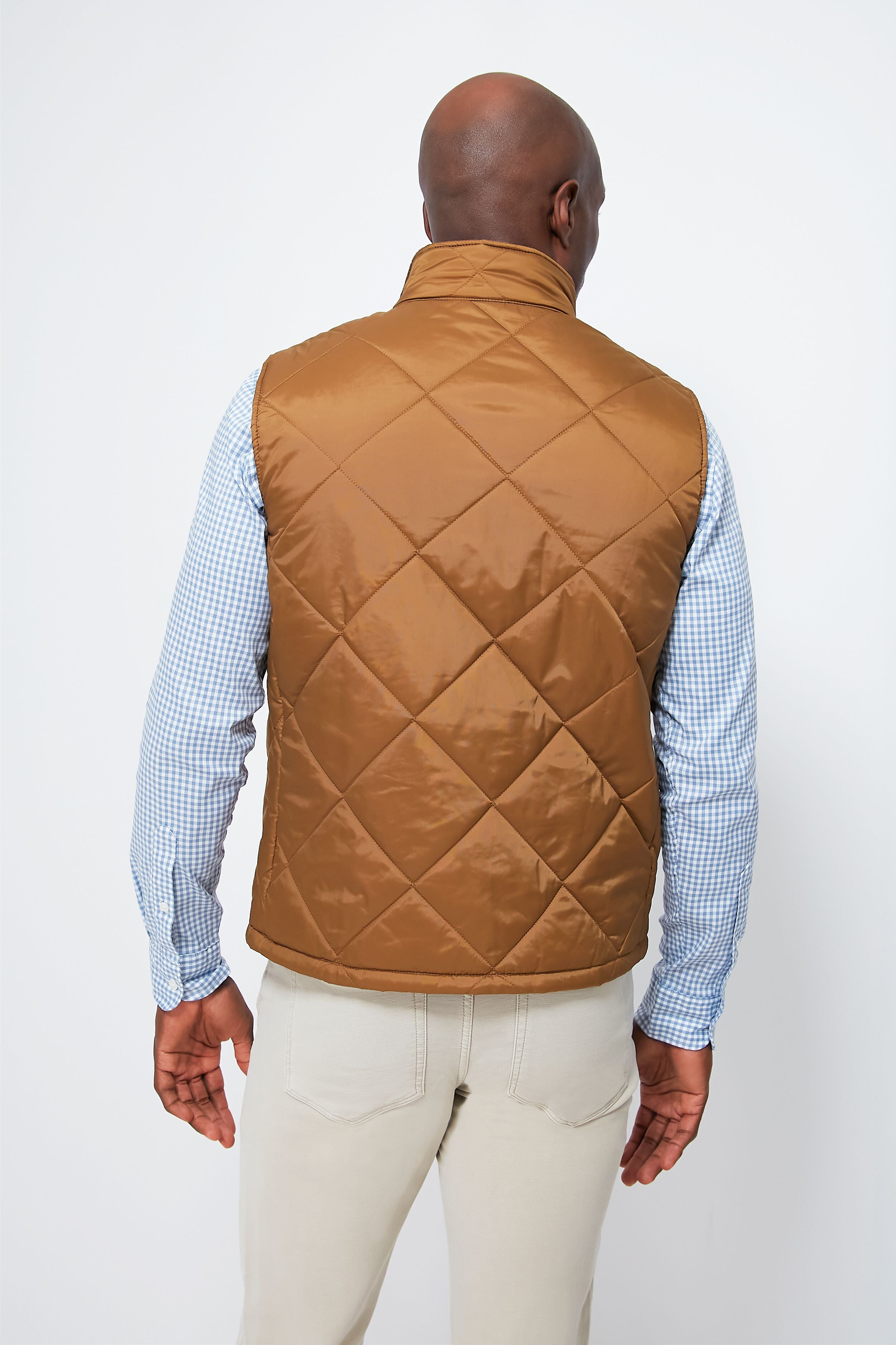 Keep cozy when out and about on blustery days in the Gold Finnar Gilet. There are endless thoughtful details added throughout this number. boasting an all over large box quilt design and a stand collar with a corduroy interior. you'll be looking sharp and feeling warm with this vest. Constructed with function in mind. it also features two roomy welt pockets and an inner patch pocket. to keep you moving throughout the day. Perfect for layering all year long. we are wearing this over polos. button downs. henleys– you name it!