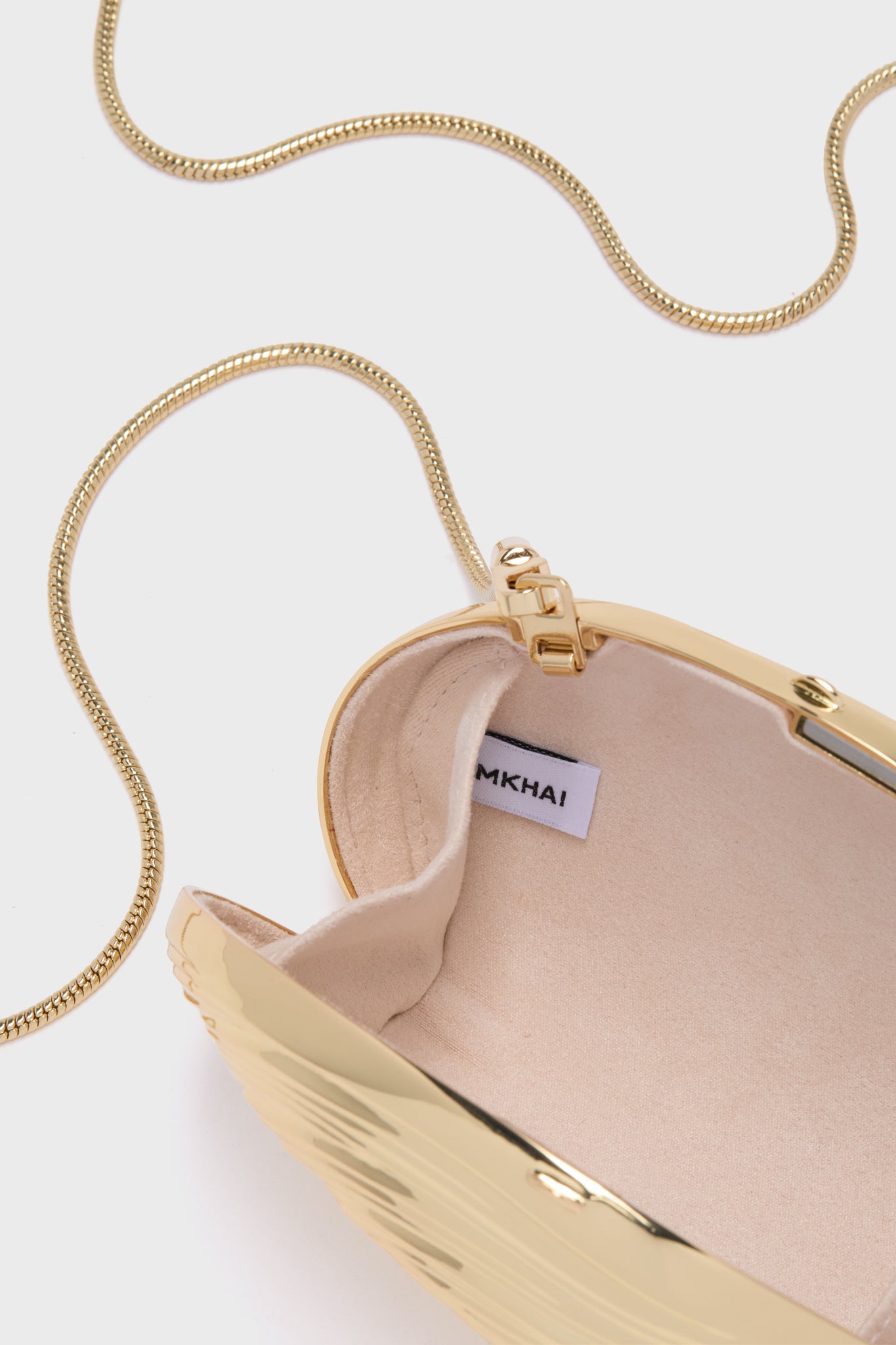 Complete any sophisticated party look with a perfect finishing touch like the Gold Mini Bridget Oyster Shell Clutch! Cast from metal and designed as a hardshell clamshell case elegantly shaped like an oyster. this glamorous piece has satin lined interior and is perfect for storing your night-out essentials. while a detachable gold chain allows you to style it as a crossbody!