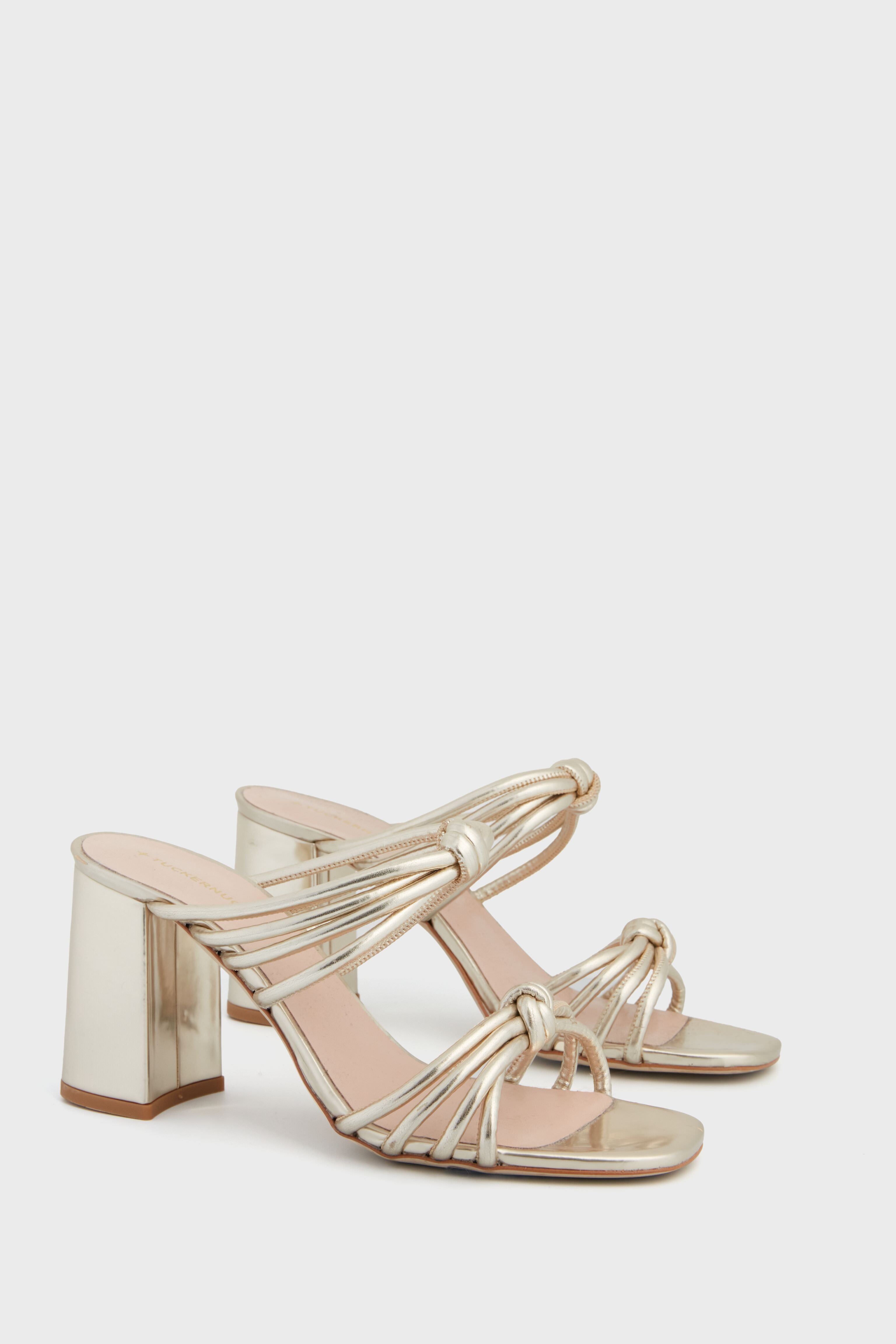 Glamorous and statement-making. the Gold Sonia Heels are occasion-ready. Designed to last all night long. these strappy stunners have memory foam inserted at the ball of the foot and a comfortable silhouette made from soft leather that you won't slip out of no matter how humid it is outside (no cinderella stories here!). With a block heel that works well for walking on uneven surfaces (hello outdoor weddings) and dual straps complete with knotted detailing. we're sure this easy to wear and elevated style will be a winner all summer long. Ideal for the dance floor. date nights. or any party on your social calendar. we know you'll be constantly reaching for these beauties.