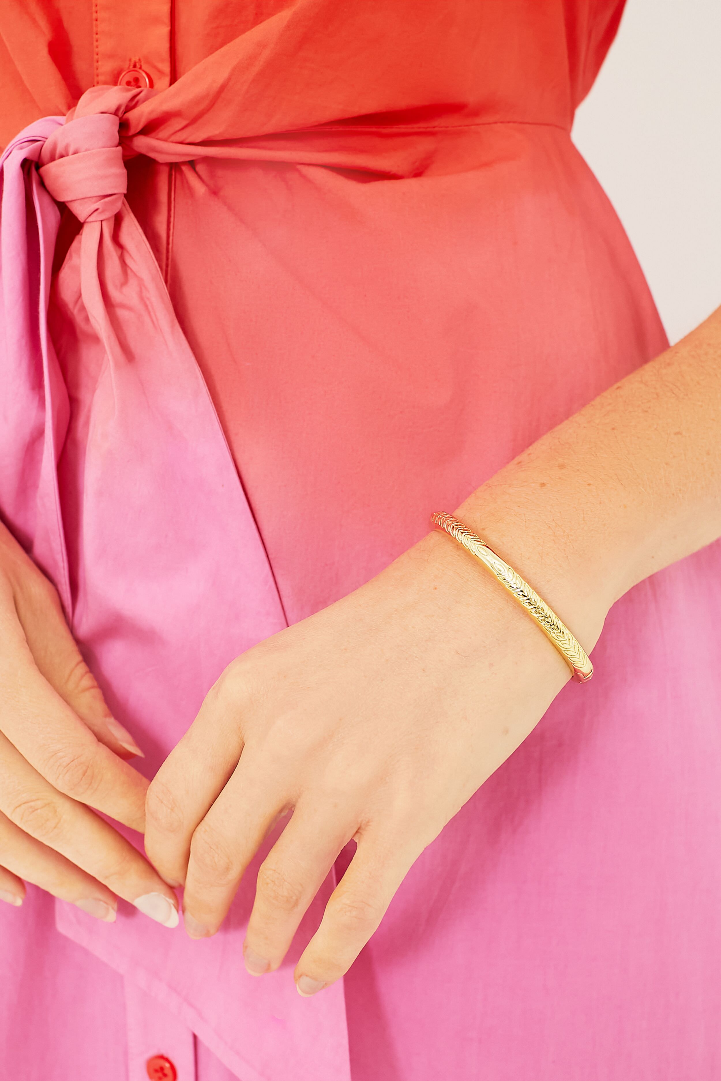 The Gold Virginia Etched Bracelet is a sleek. heirloom-inspired addition to your jewelry collection. A hinge design with a delicate botanical-inspired motif. this elegant-yet-understated accessory will perfectly compliment any outfit. A style that can be worn every single day. pair this with everything in your closet from tees and denim shorts to cocktail dresses and heels.