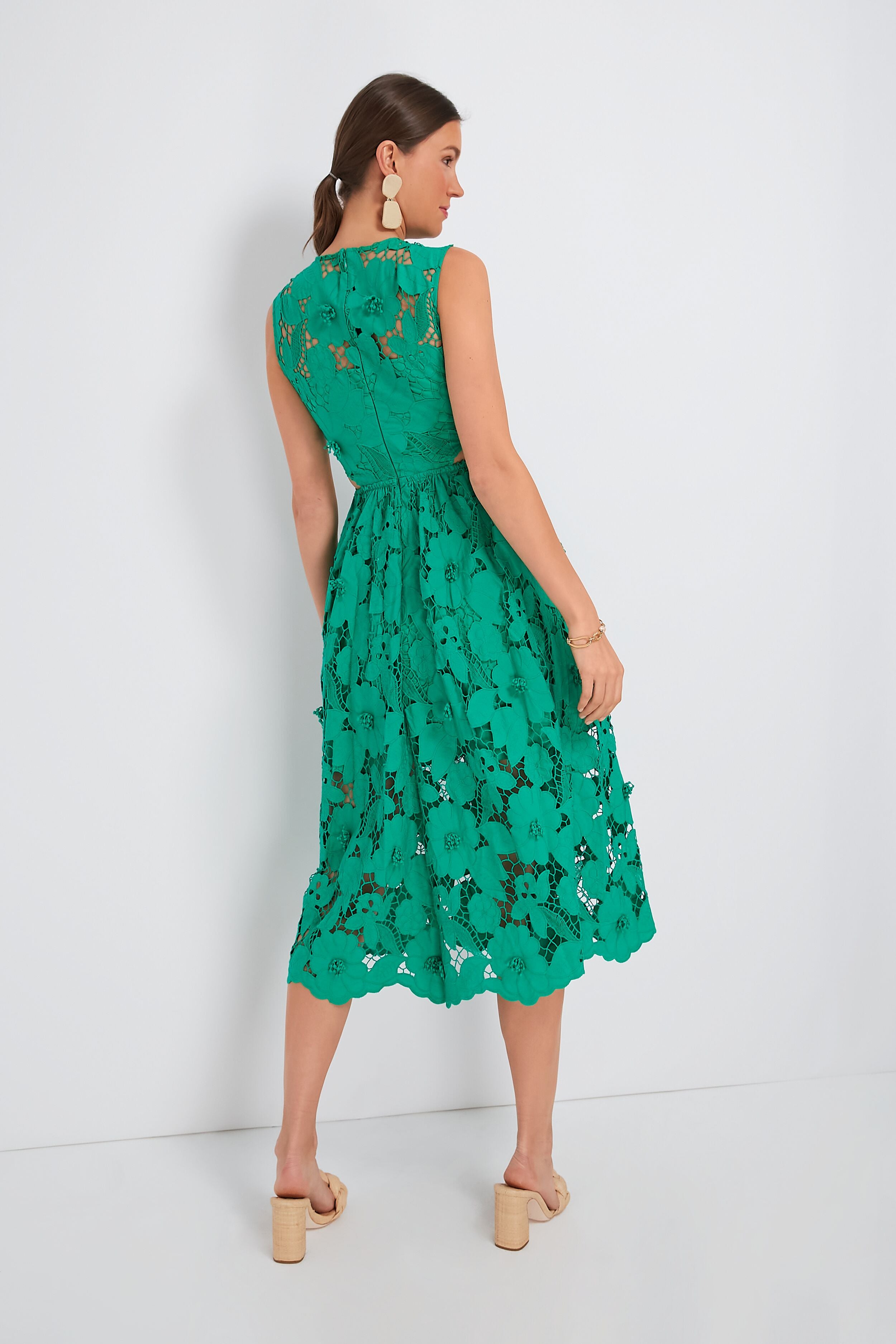 Crafted from sculpturally rich fabric in a verdant shade. the Green 3D Cotton Lace Dress is equal parts feminine and bold. The fitted bodice is framed by a round neckline and waist cut-outs which accentuate your silhouette. and a flowing skirt that is partially lined completes this breath-taking midi. Pair it with sandals for your next garden party or with heels and statement earrings for sunny occasions.