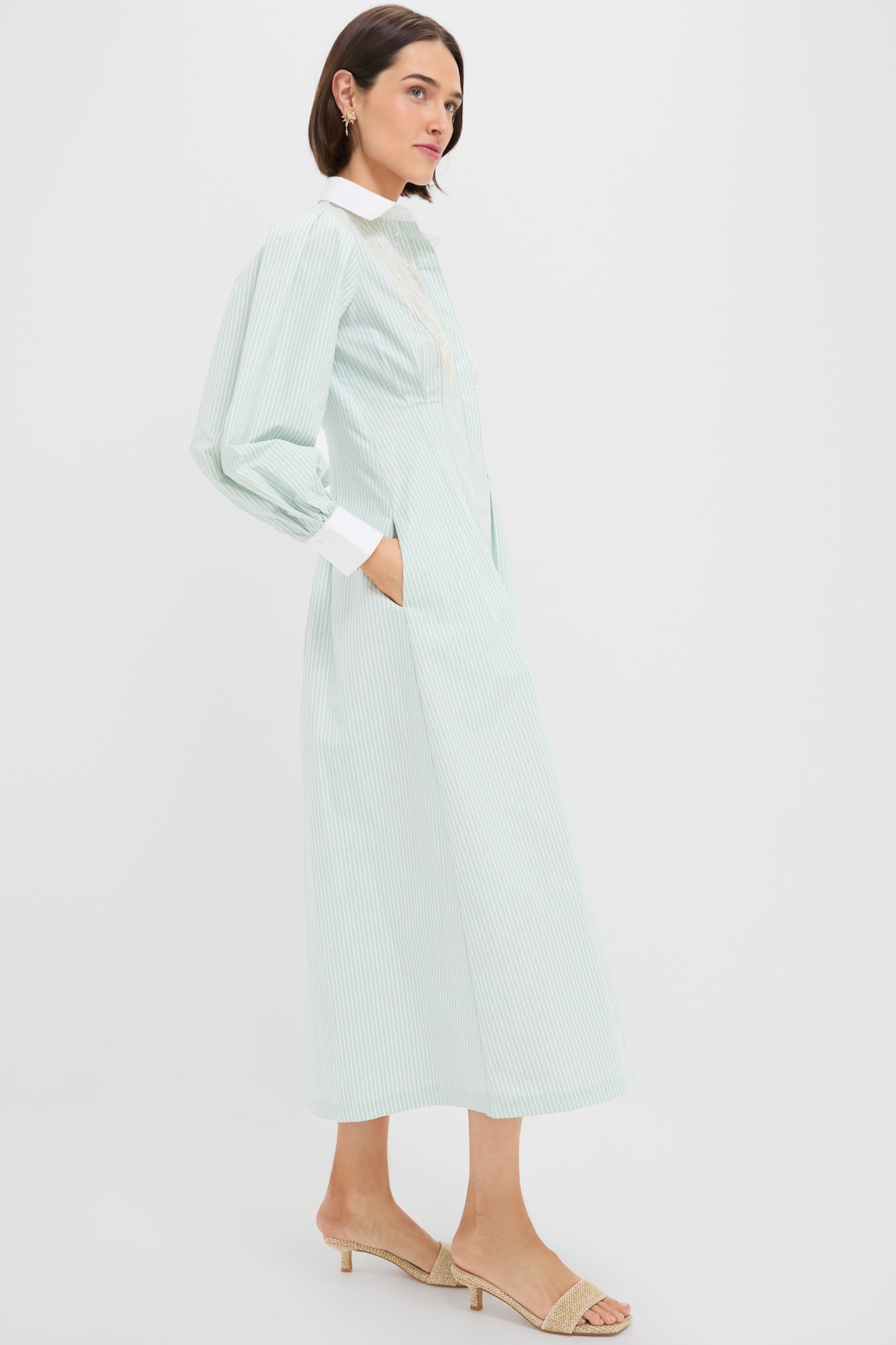 The Green and White Embellished Stripe Corinne Dress is an elevated everyday maxi that boasts feminine ballon sleeves. pleating along the waist for added shape. and beaded embellished chest that adds a special touch. Pair with sandals. flats. or heels. whatever the occasion calls for- this dress can do it all!